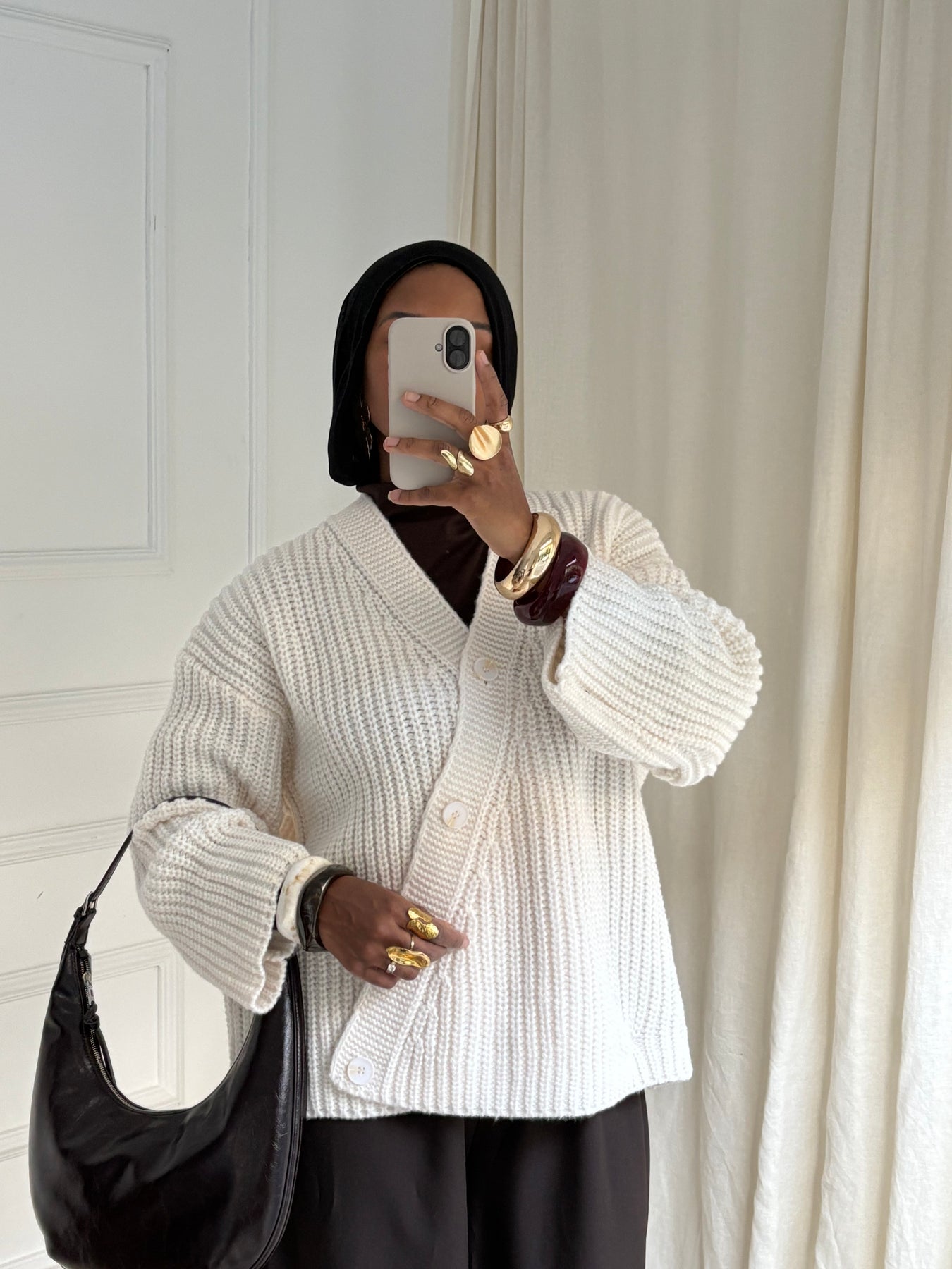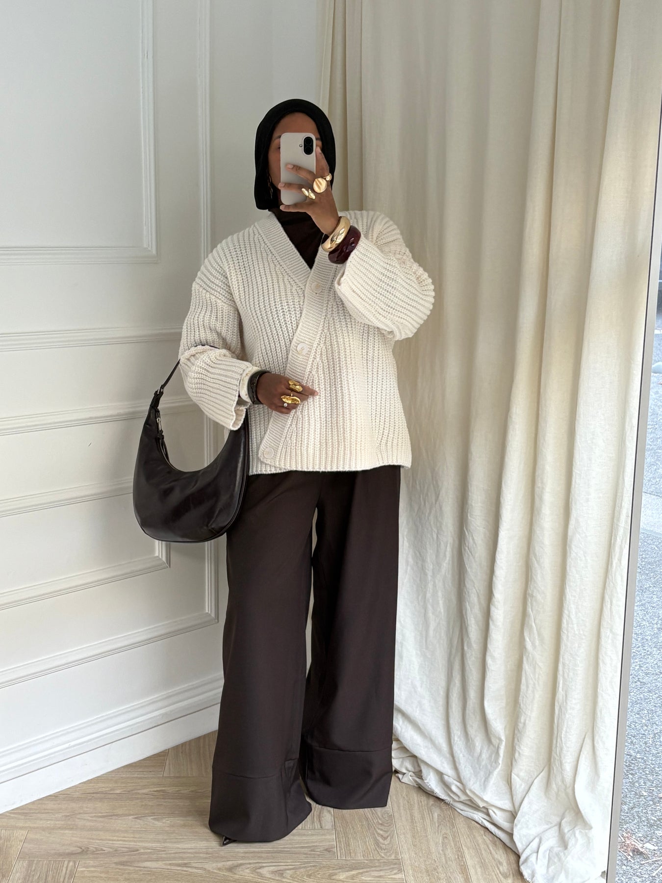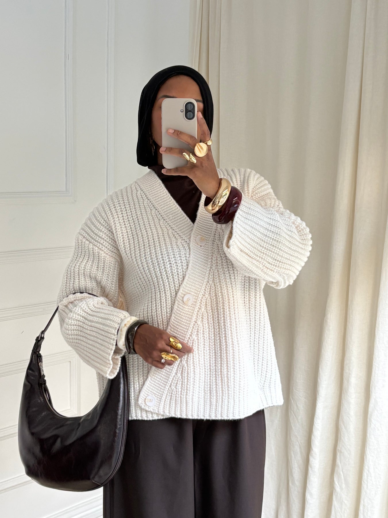 Un cardigan pensé pour les journées froides, où l’on veut rester chaleureuse, élégante et couverte.