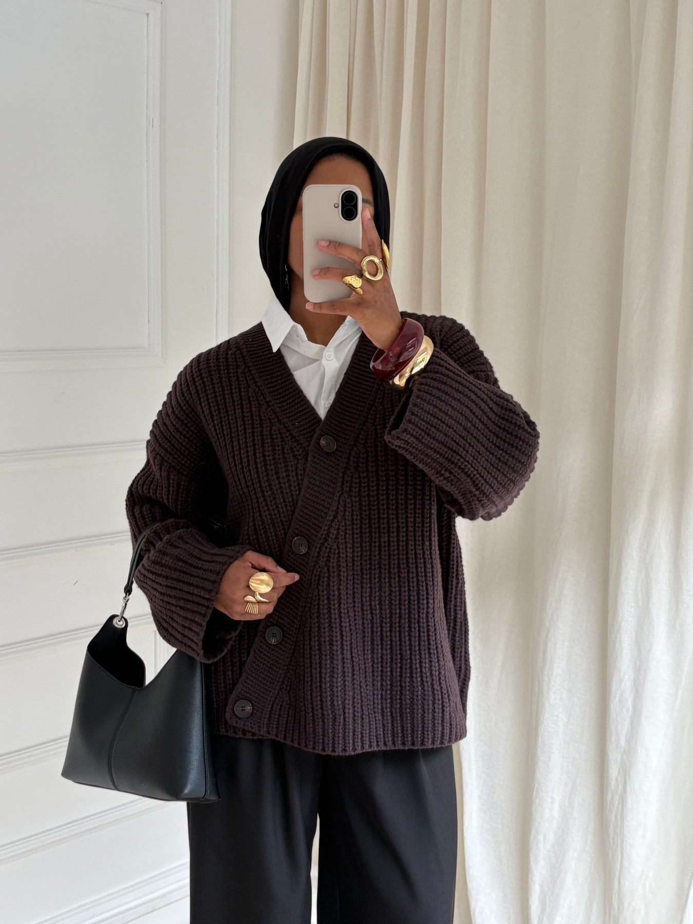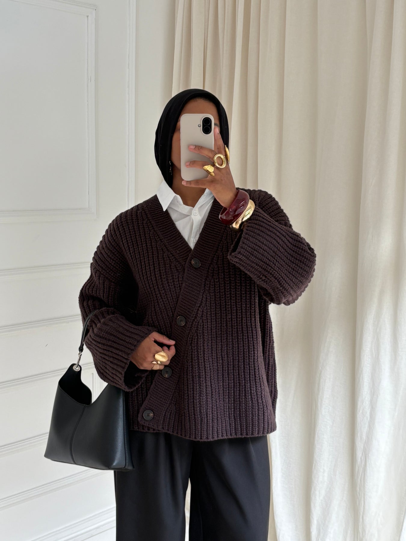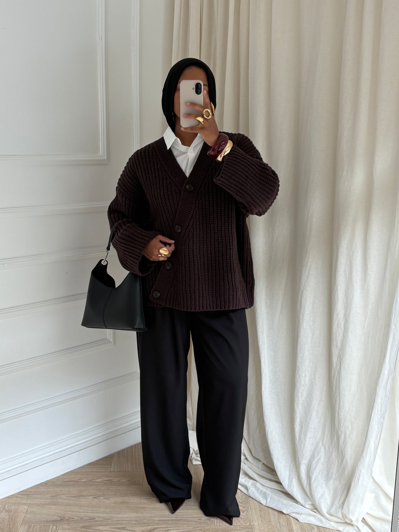 Un cardigan pensé pour les journées froides, où l’on veut rester chaleureuse, élégante et couverte.