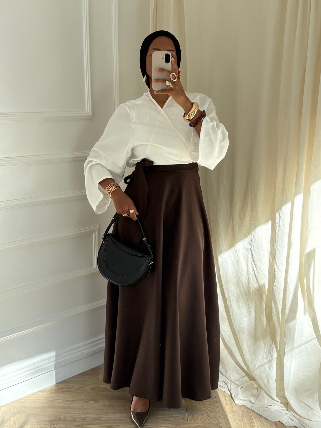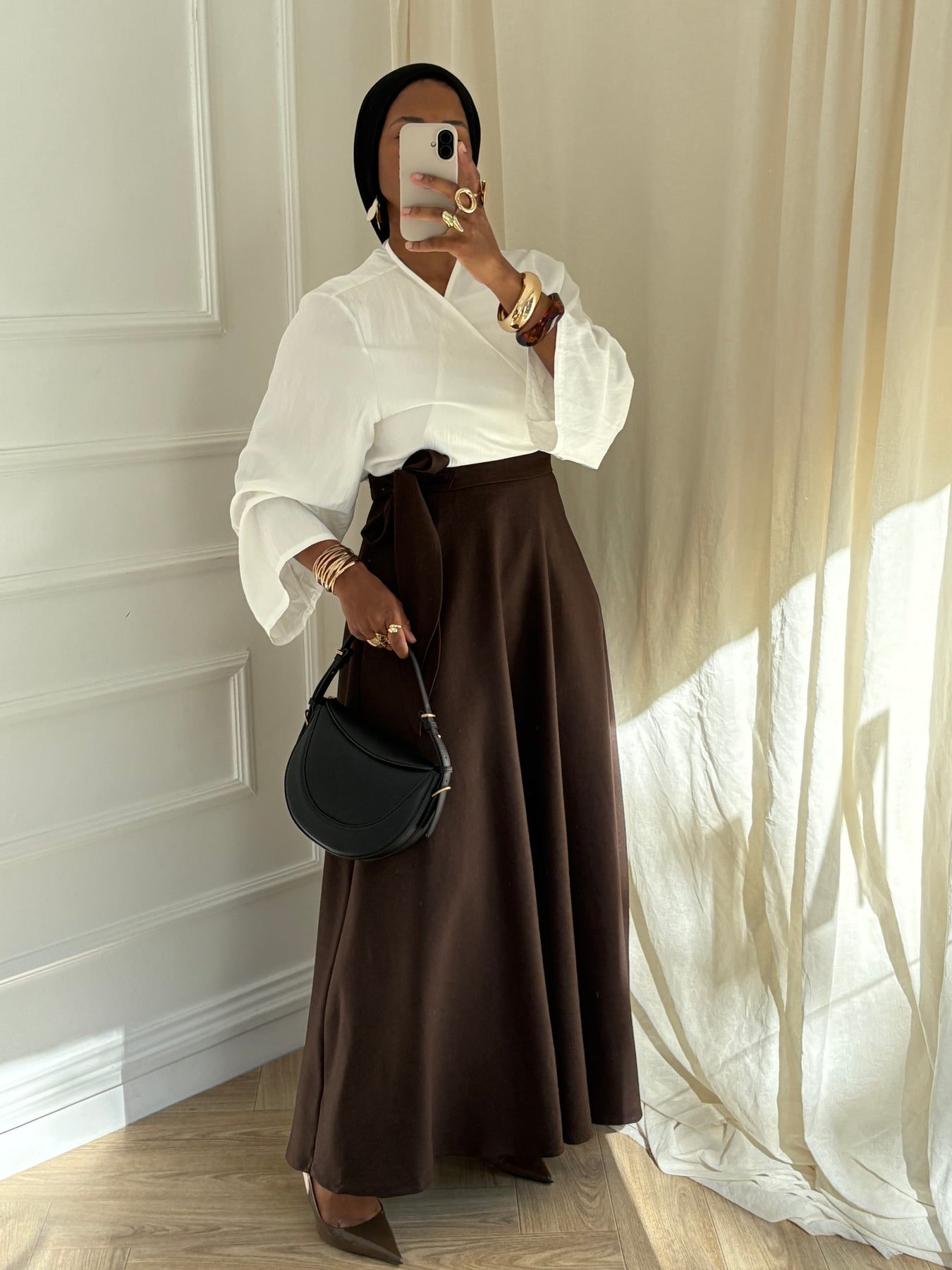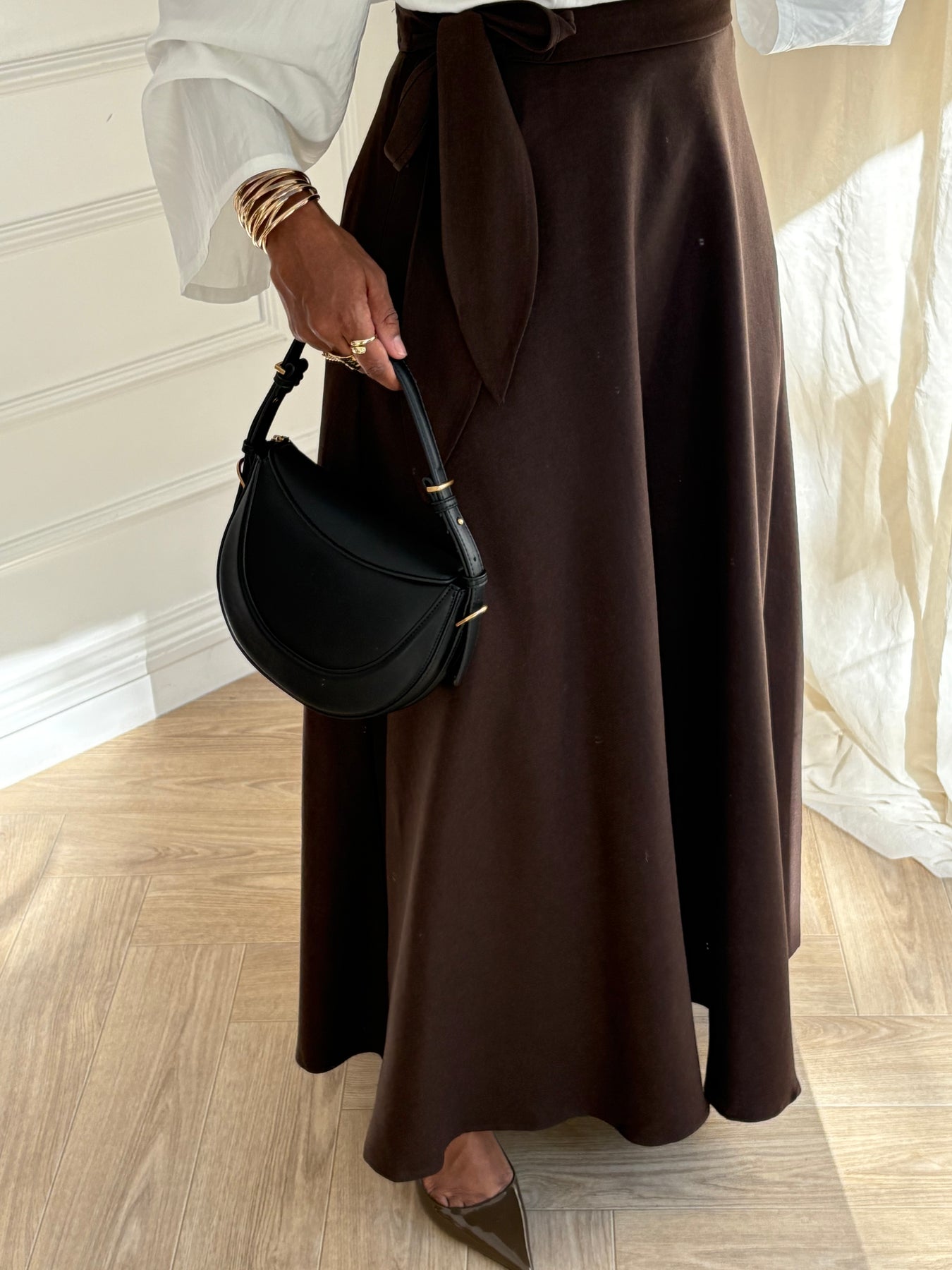 Jupe longue évasée avec ceinture à nouer à la taille.
