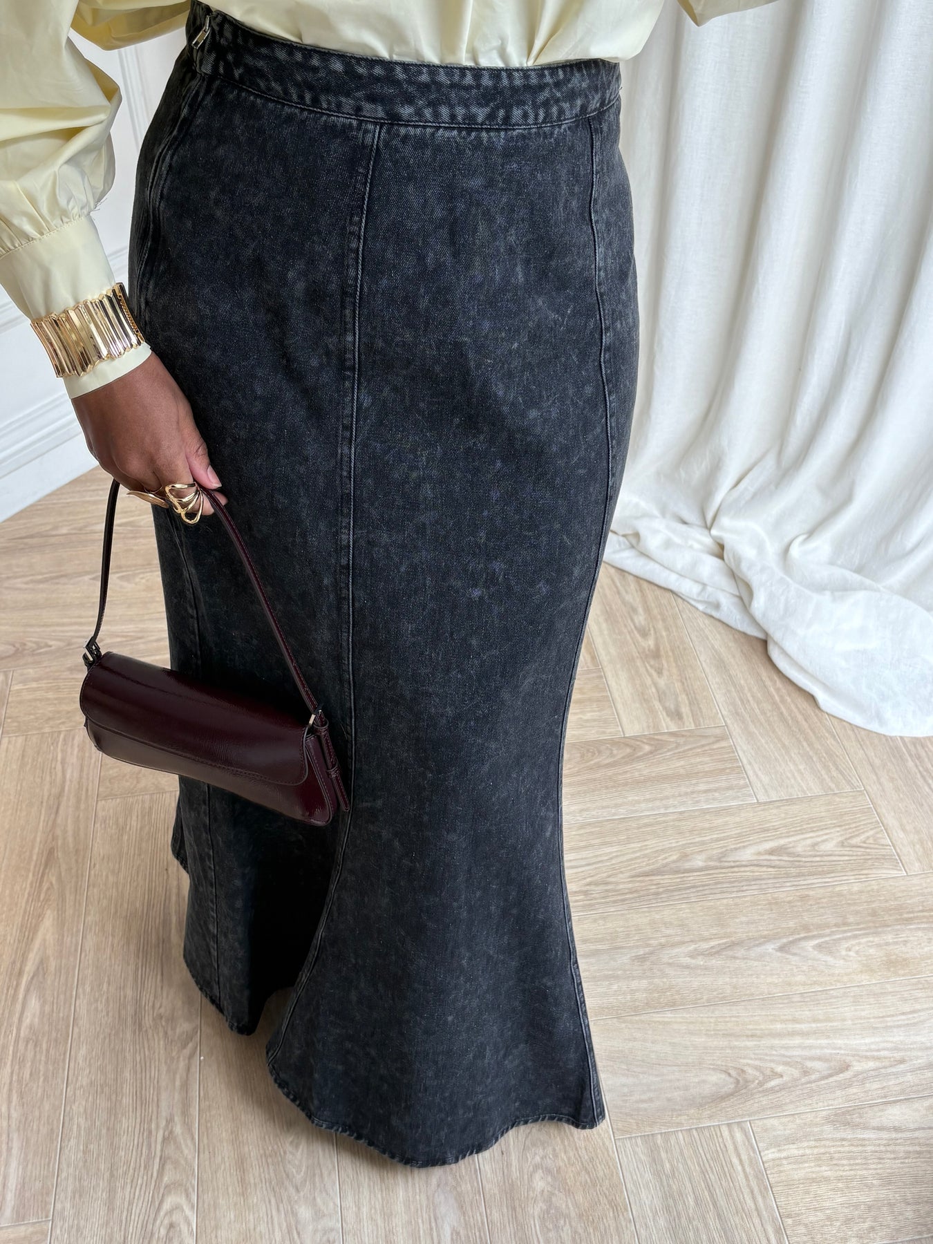 Cette jupe en denim effet sirène est un indispensable pour les amatrices de looks sobres et stylés. Sa coupe évasée en bas allonge la silhouette tout en restant ultra confortable. Elle épouse les formes sans les mouler, tout en offrant une belle liberté de mouvement.