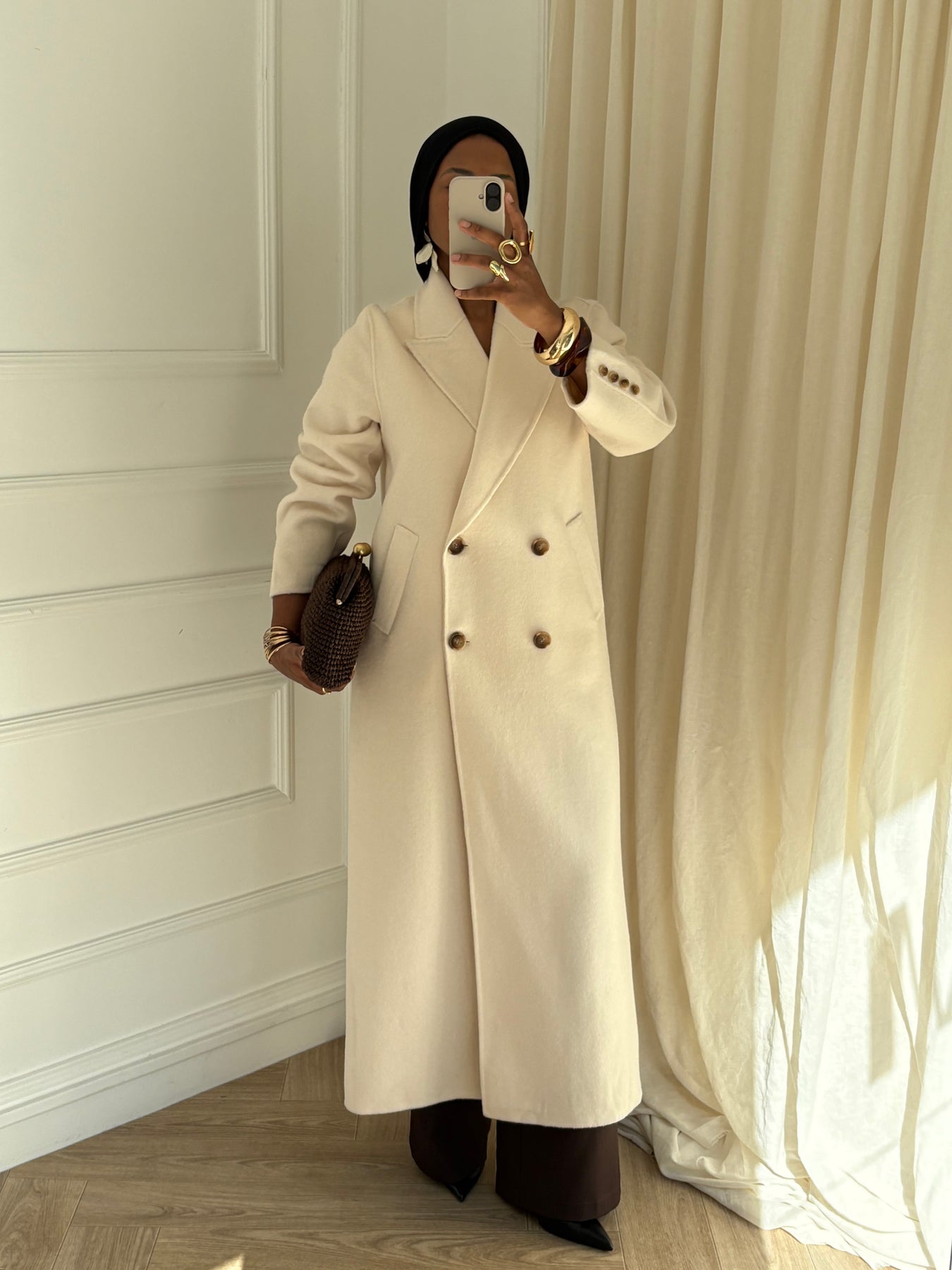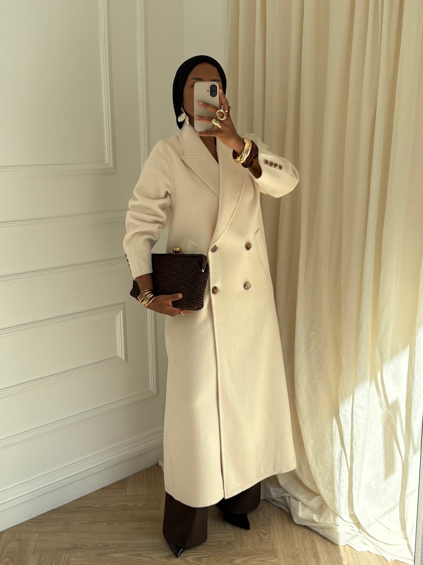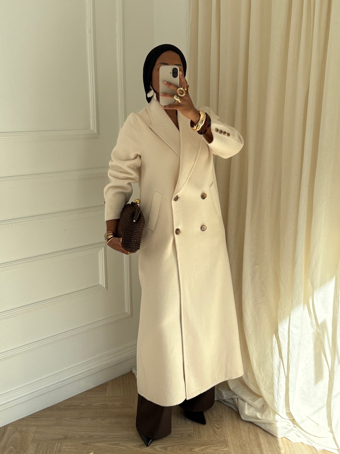 Manteau extra long confectionné à la main, au tombé élégant et à la coupe intemporelle.
