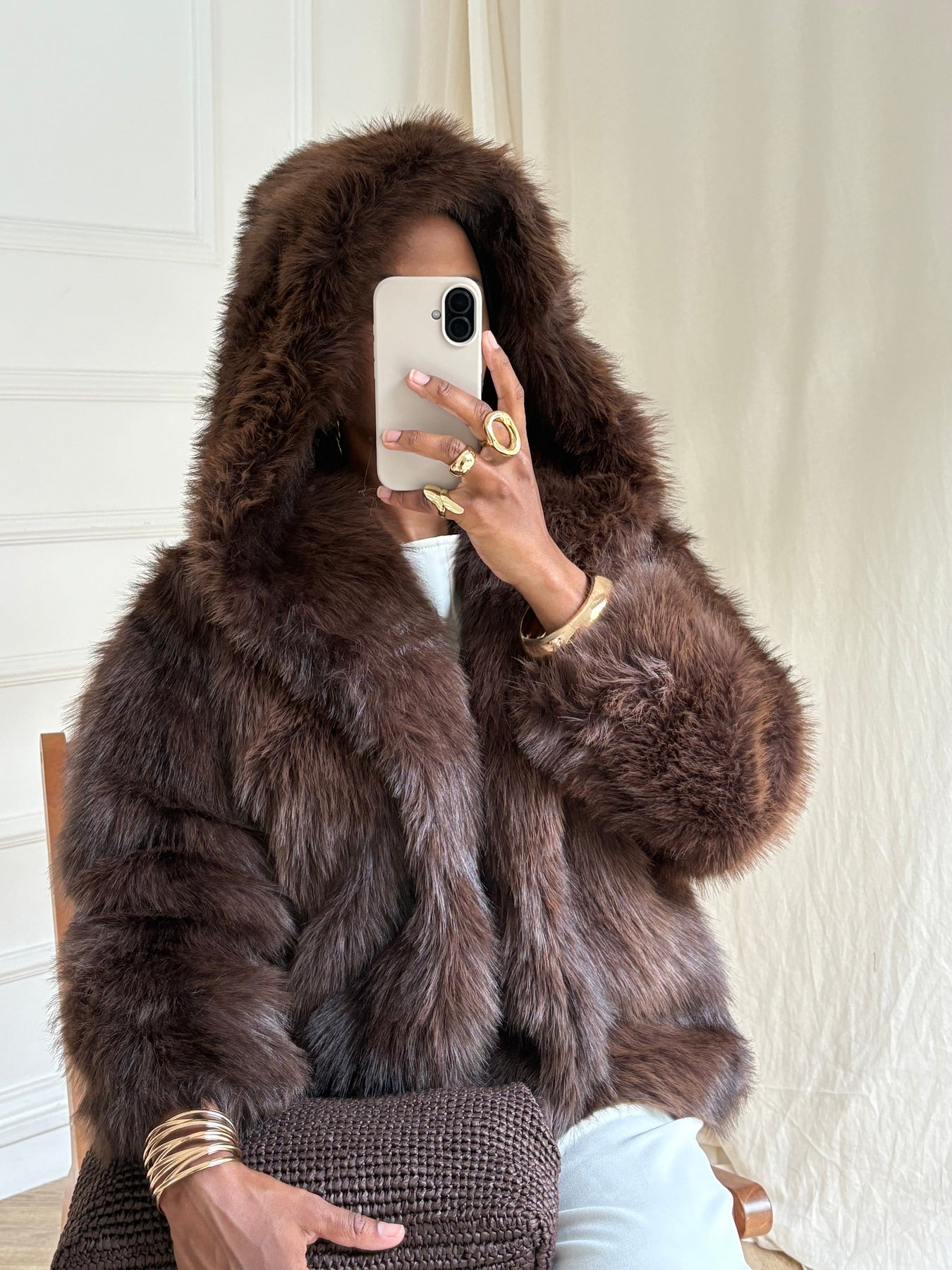 Coupe : Courte et volumineuse, avec capuche enveloppante