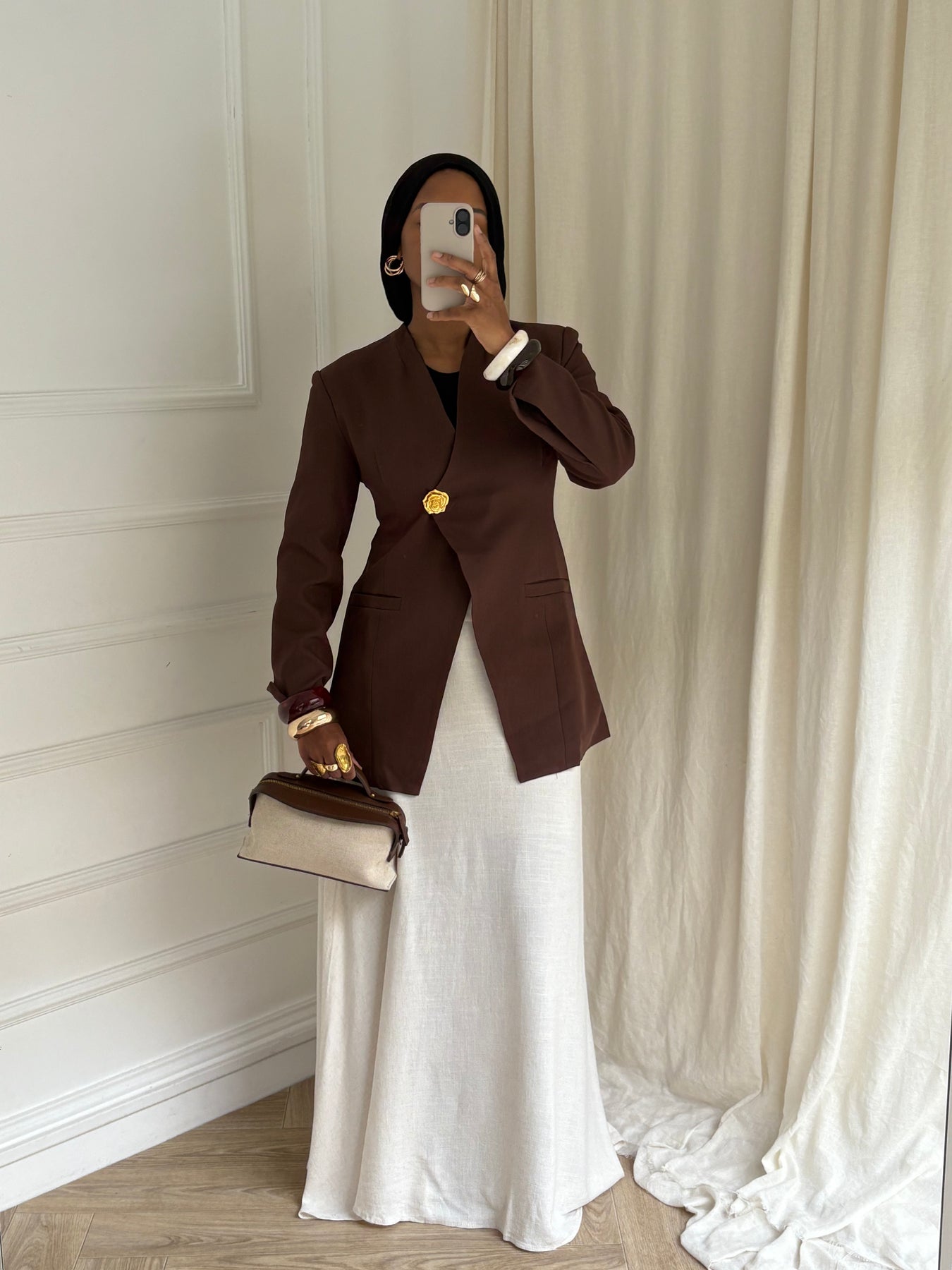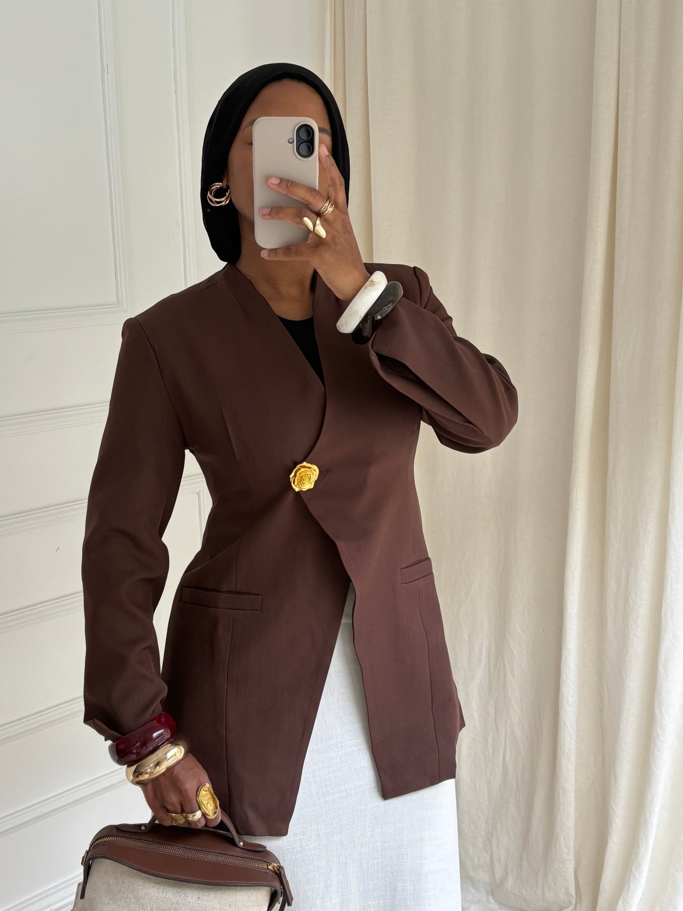 Sa matière mi-coton, mi-polyester lui confère une tenue structurée et raffinée, tandis que son bouton fleur doré apporte une touche de féminité délicate.