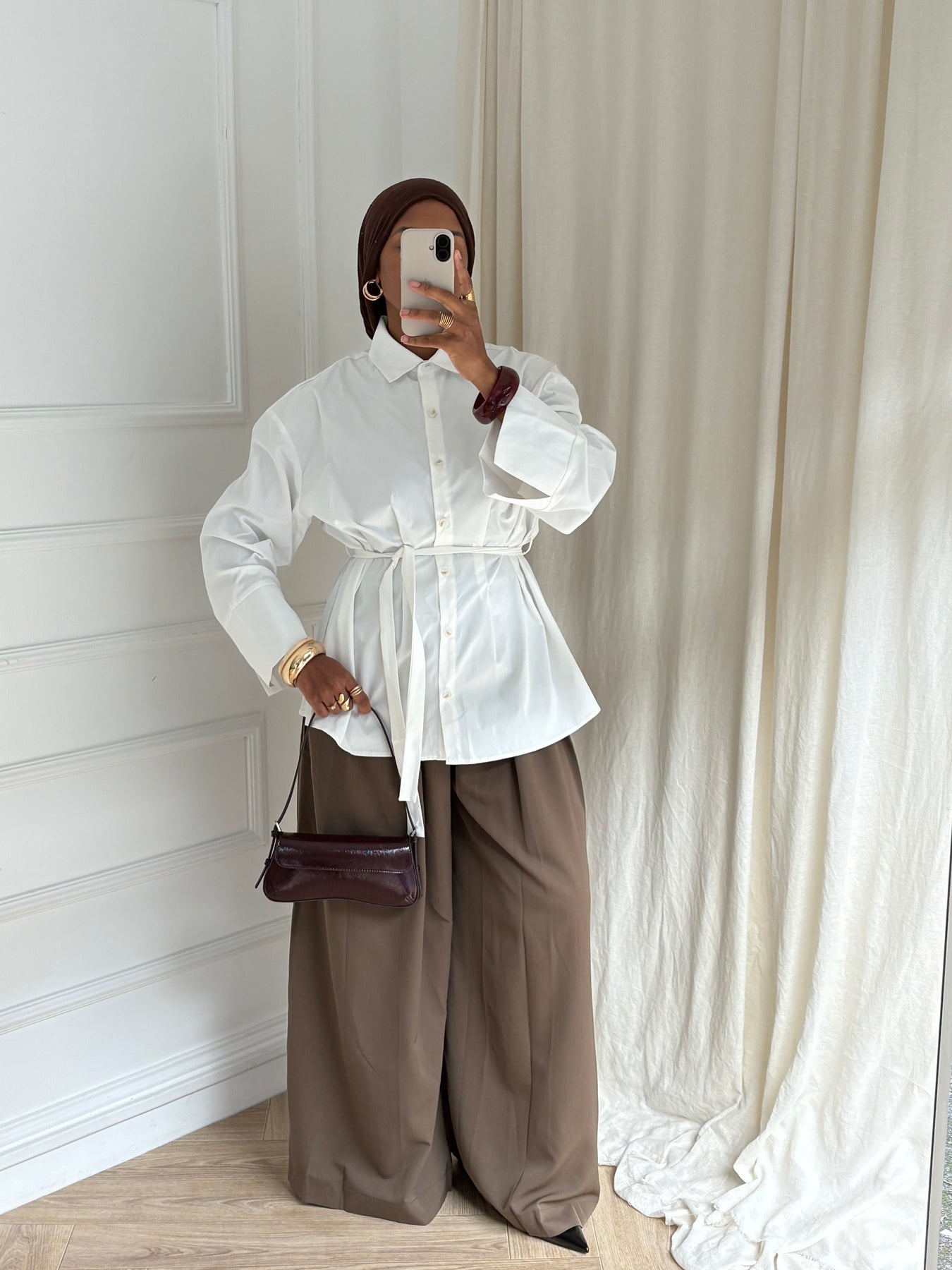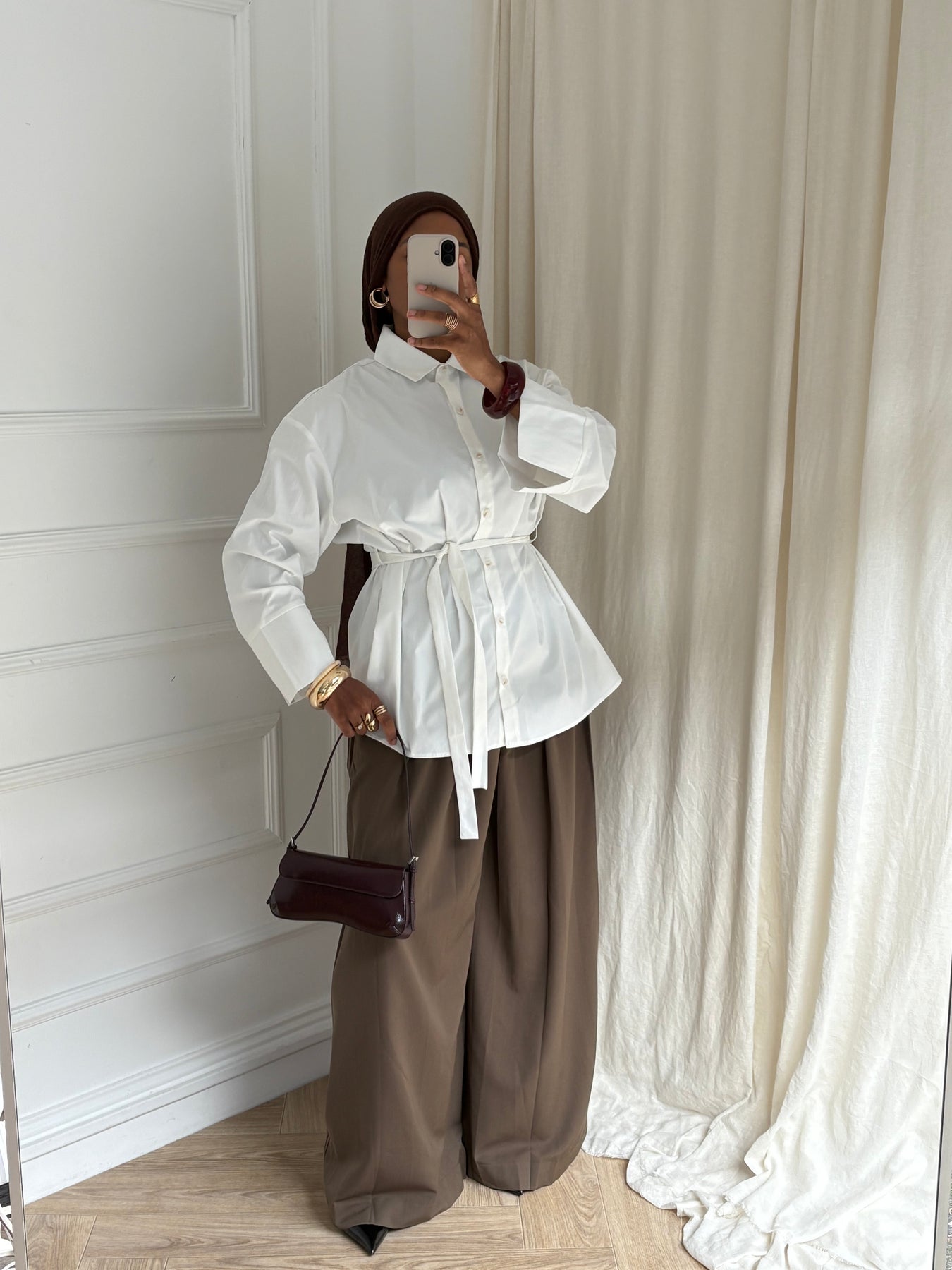 Blouse ample au tombé fluide et structuré. Manches longues évasées pour une touche sophistiquée. Se porte avec ou sans ceinture pour un rendu plus ou moins cintré. Parfaite avec une jupe longue ou un pantalon large pour un look chic et modest.