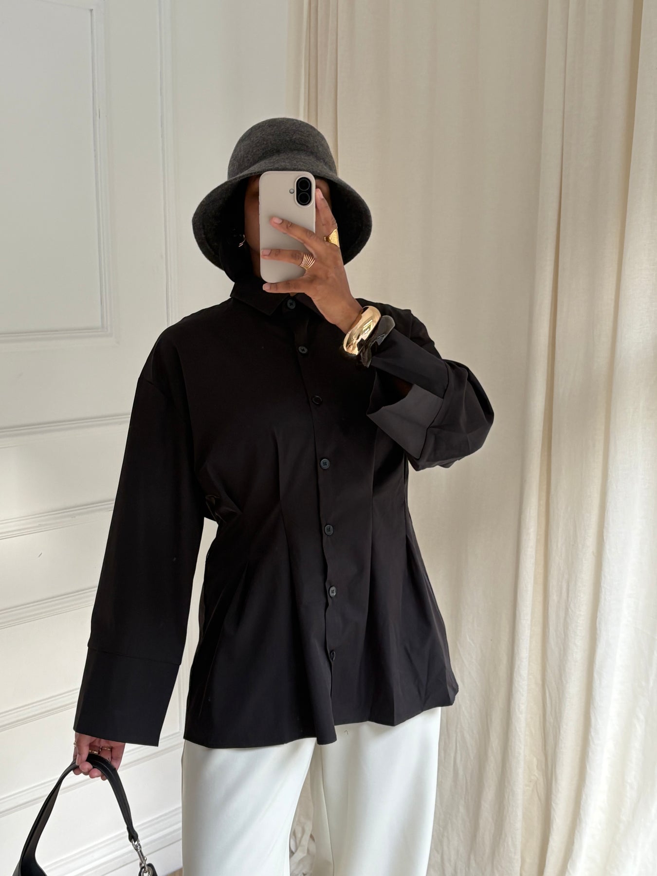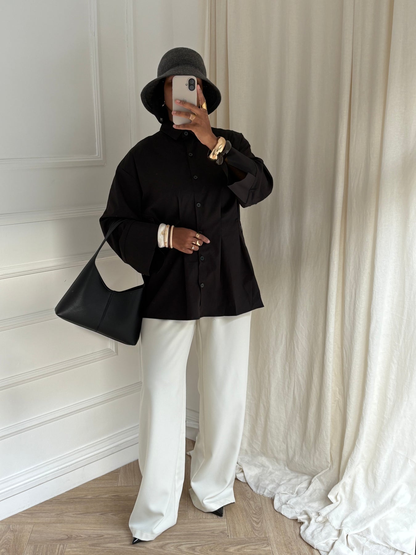 Blouse ample au tombé fluide et structuré. Manches longues évasées pour une touche sophistiquée. Se porte avec ou sans ceinture pour un rendu plus ou moins cintré. Parfaite avec une jupe longue ou un pantalon large pour un look chic et modest.