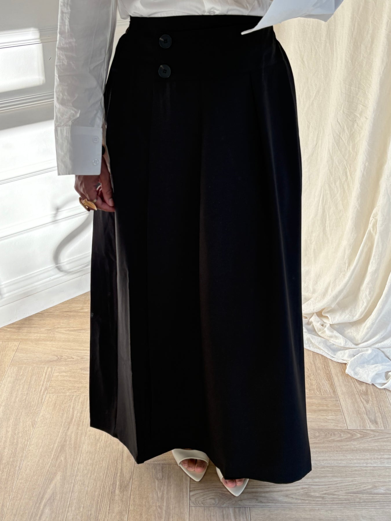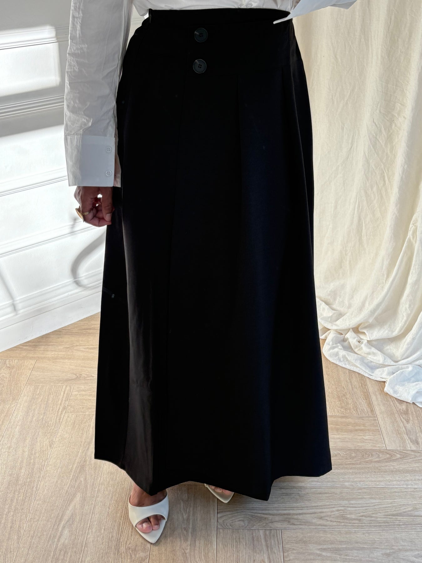 Jupe longue élégante confectionnée dans un tissu fluide et légèrement extensible. Coupe évasée avec plis marqués sur l’avant et deux boutons contrastants à la taille pour une finition raffinée. Fermeture latérale invisible.