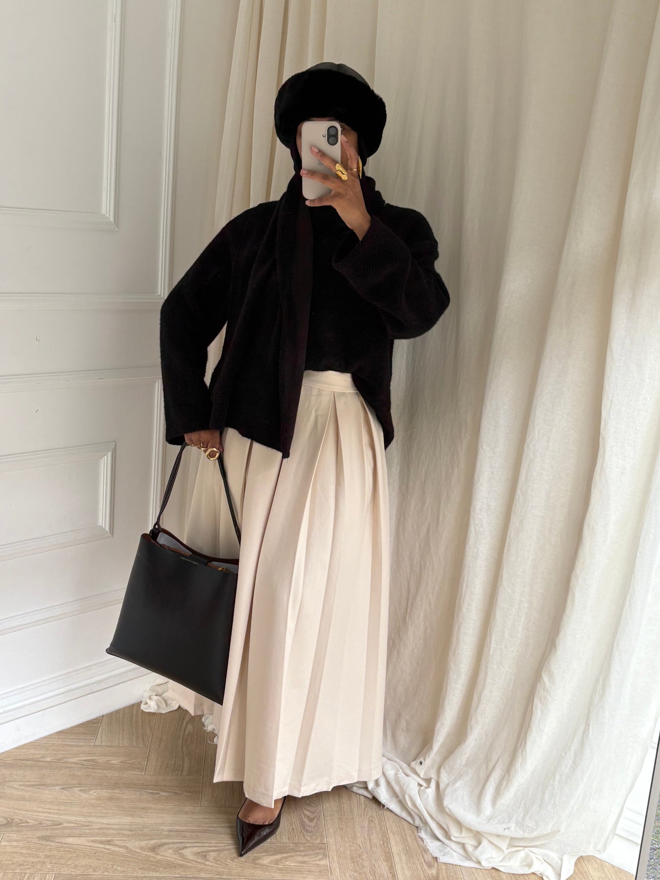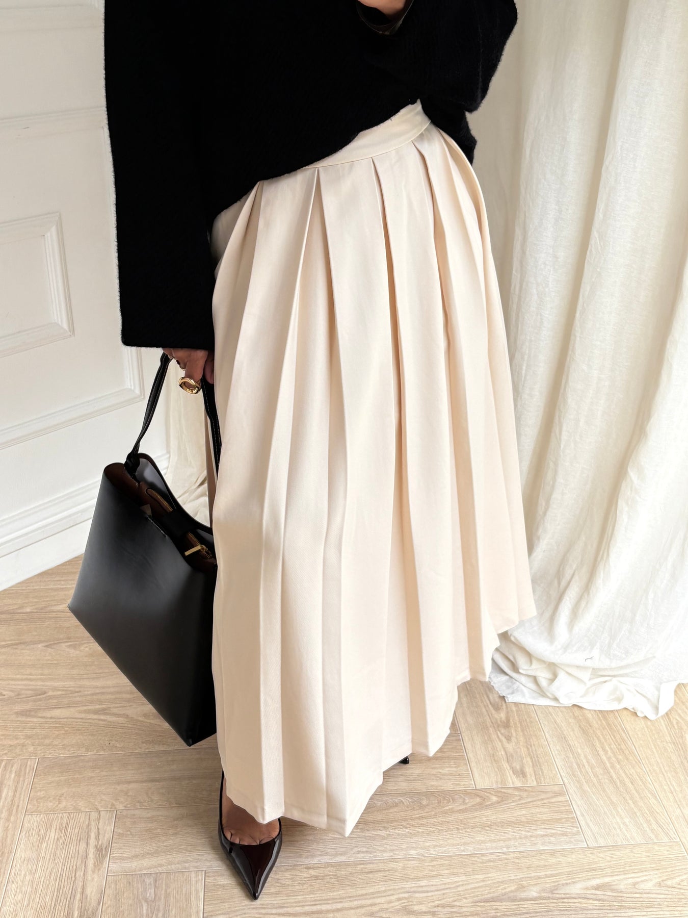 Jupe plissée au tombé lourd confectionnée dans une matière type blazer 100% polyester. Coupe élégante et structurée, offrant une silhouette longue et sophistiquée.