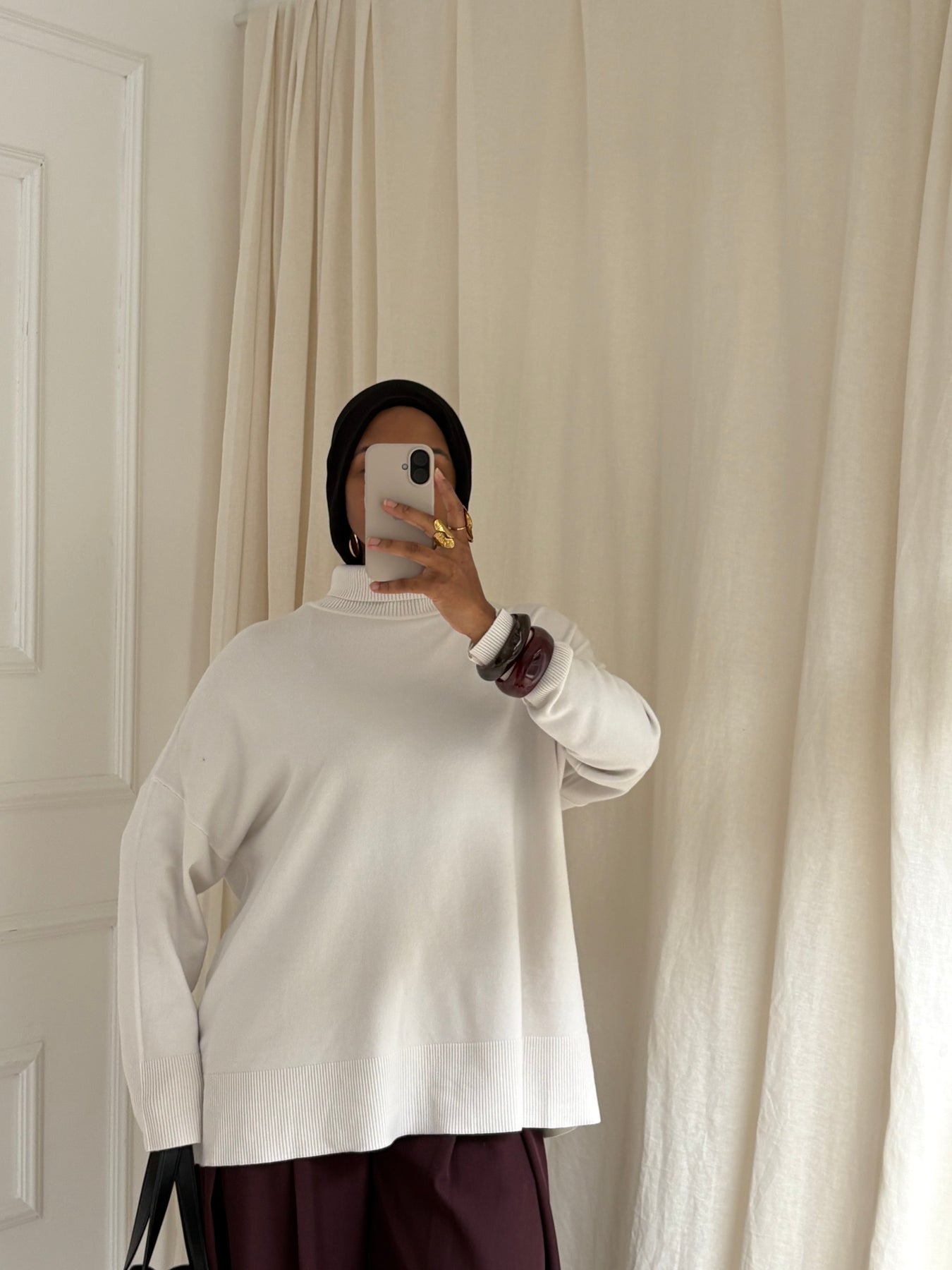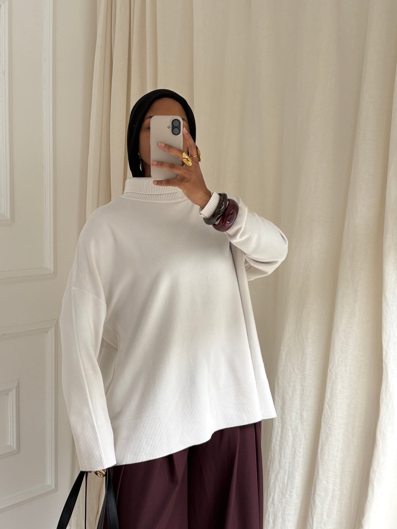 Ce pull fin à col roulé épouse délicatement la silhouette sans la mouler, idéal pour créer des looks modestes, soignés et confortables. Ultra doux au toucher, il offre une sensation seconde peau parfaite pour les journées fraîches ou pour superposer sous vos manteaux et gilets longs.