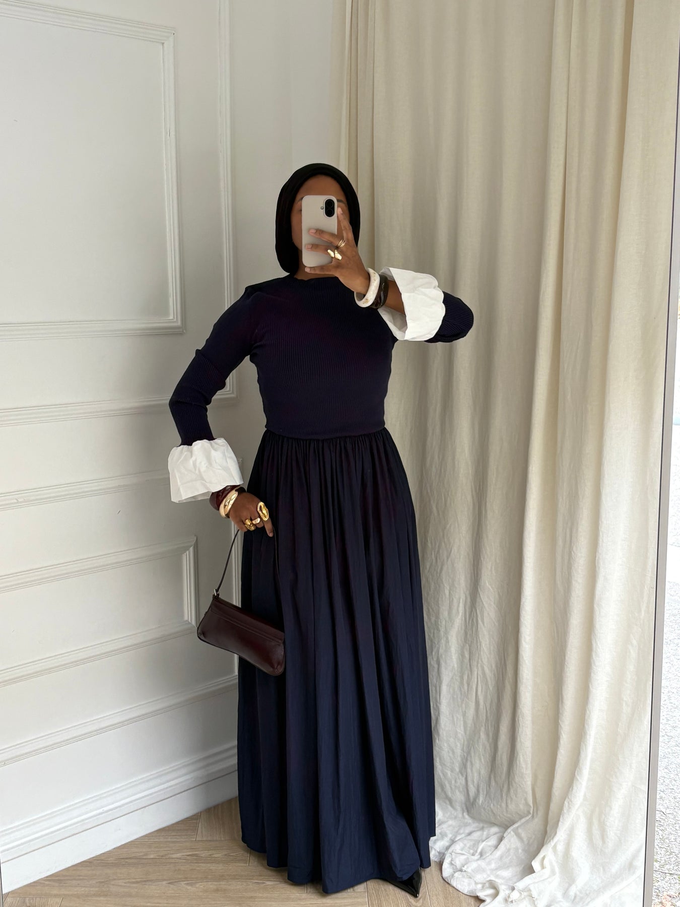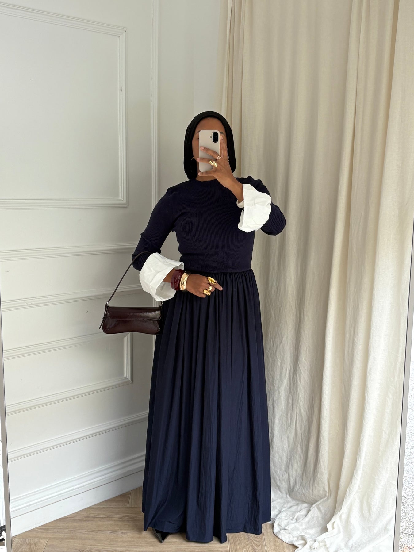 Robe en maille douce sur le haut, effet pull, et jupe fluide sur le bas pour une allure élégante et confortable. Manches longues bicolores avec partie coton blanche pour une touche moderne et contrastée. Coupe fluide, convenant à toutes les silhouettes.