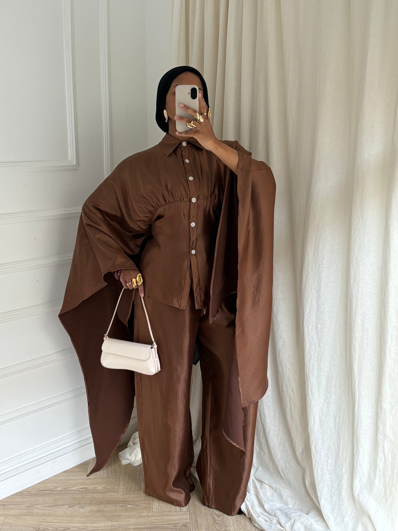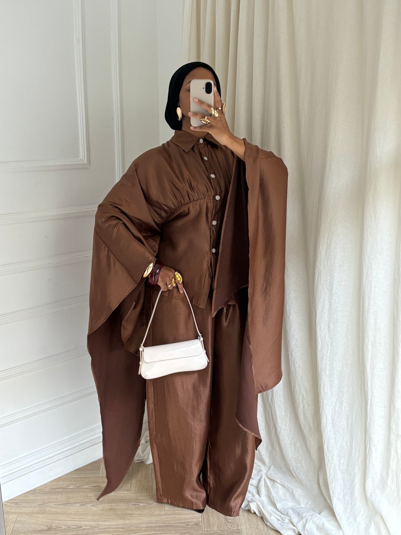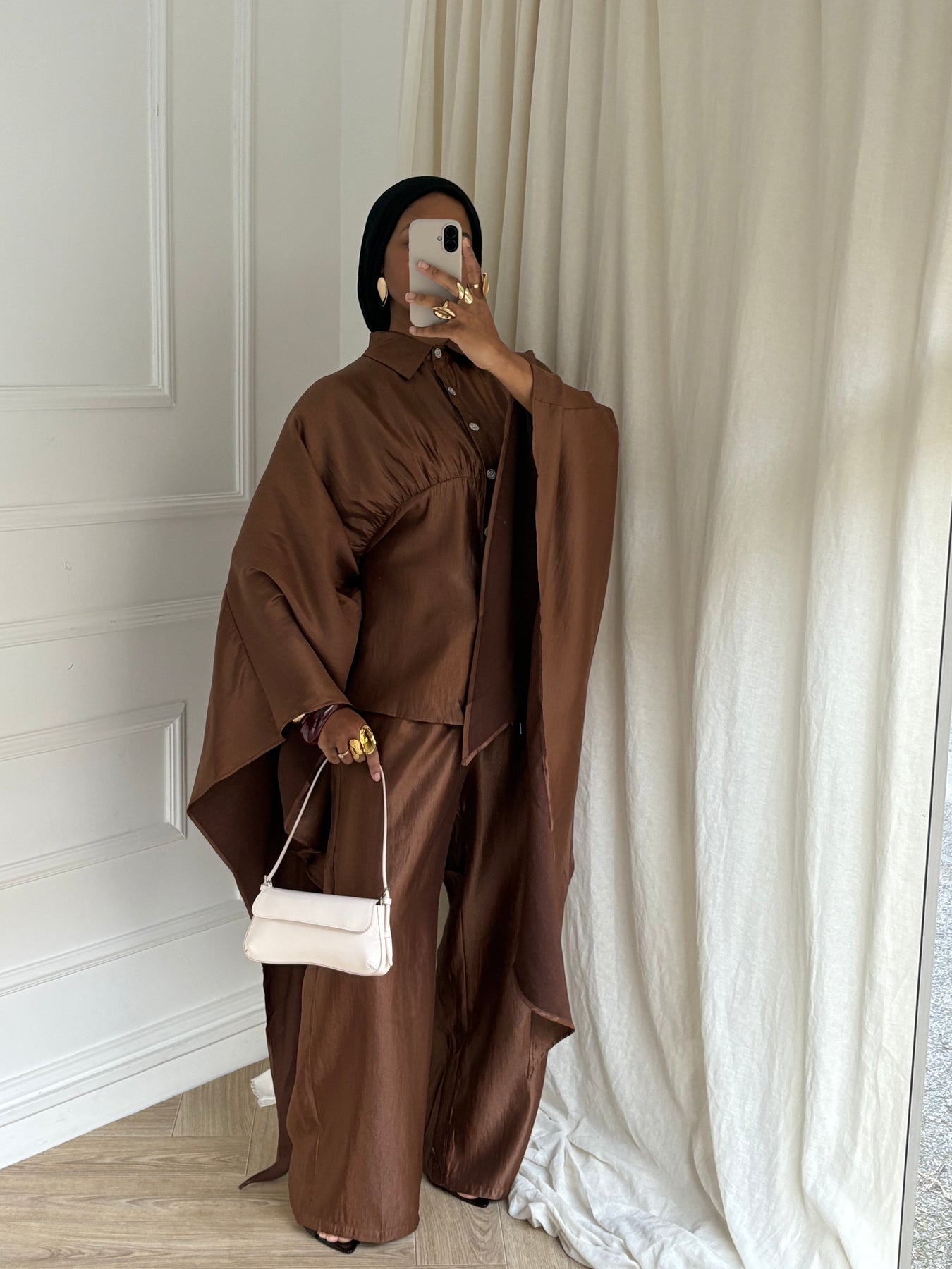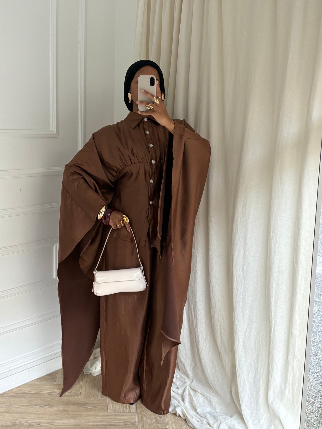 Sa ceinture intérieure discrète, située à l’intérieur du vêtement, s’attache dans le dos sans dessiner ni serrer le dos. Elle permet simplement d’ajuster la coupe à l’intérieur, tout en conservant un tombé fluide et modeste à l’extérieur.