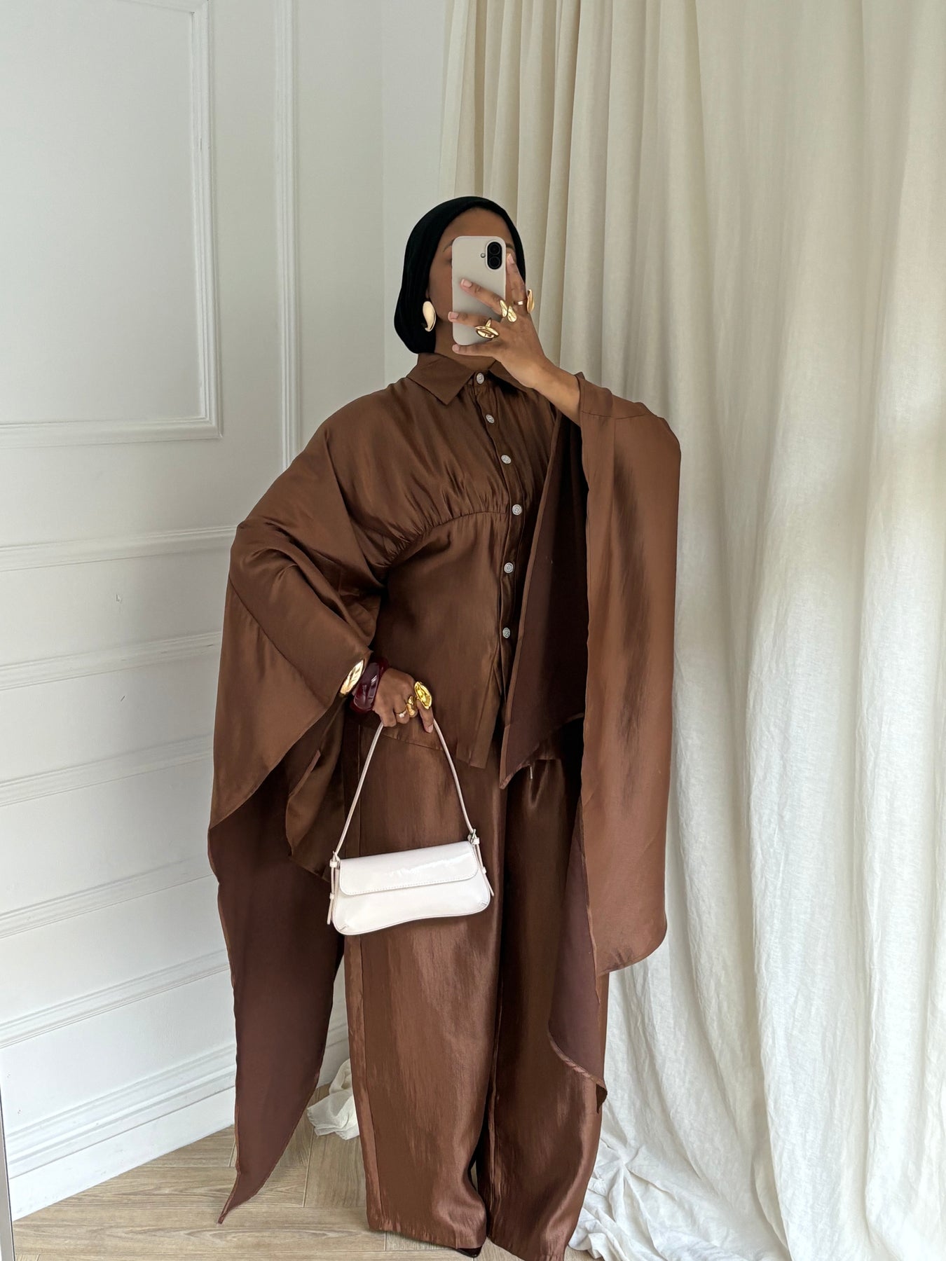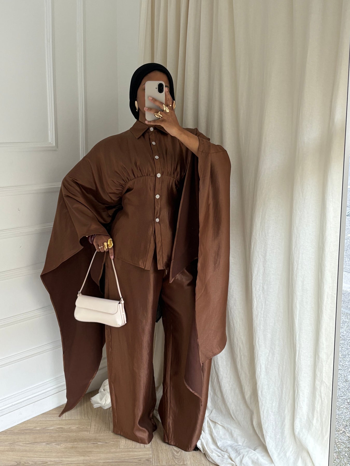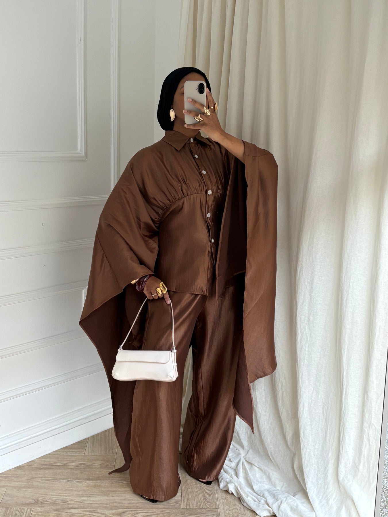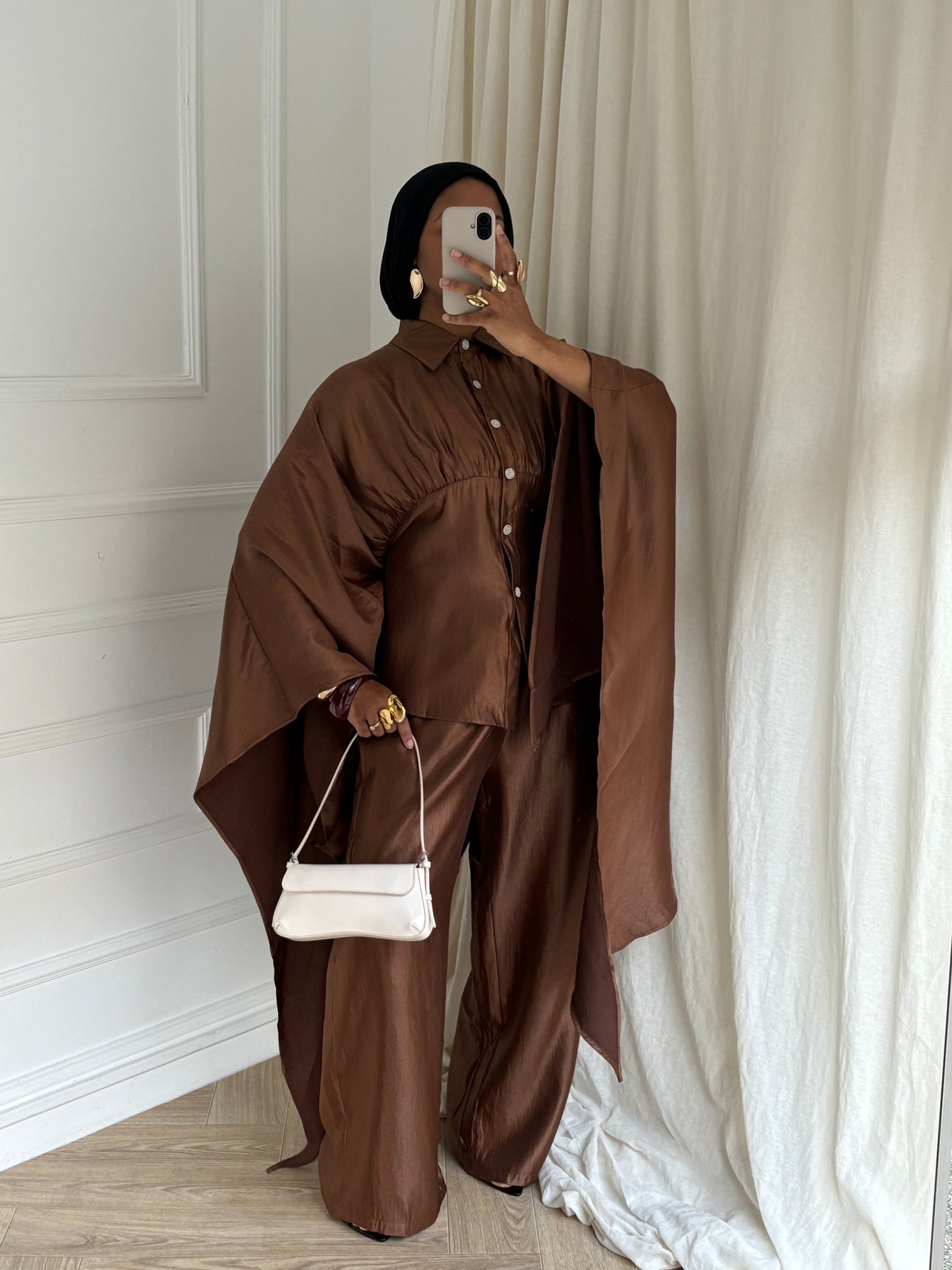 Sa ceinture intérieure discrète, située à l’intérieur du vêtement, s’attache dans le dos sans dessiner ni serrer le dos. Elle permet simplement d’ajuster la coupe à l’intérieur, tout en conservant un tombé fluide et modeste à l’extérieur.
