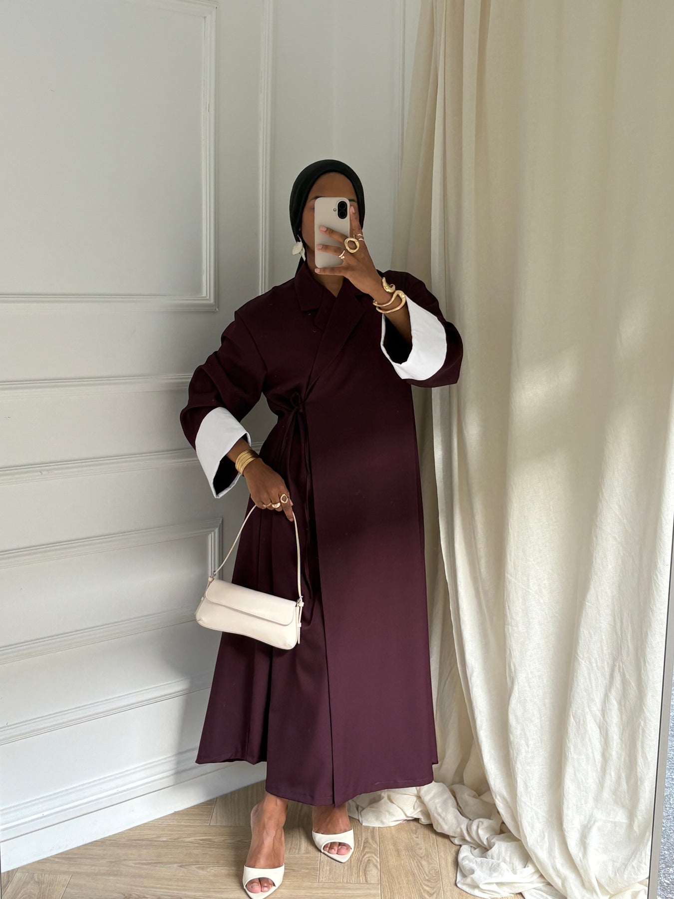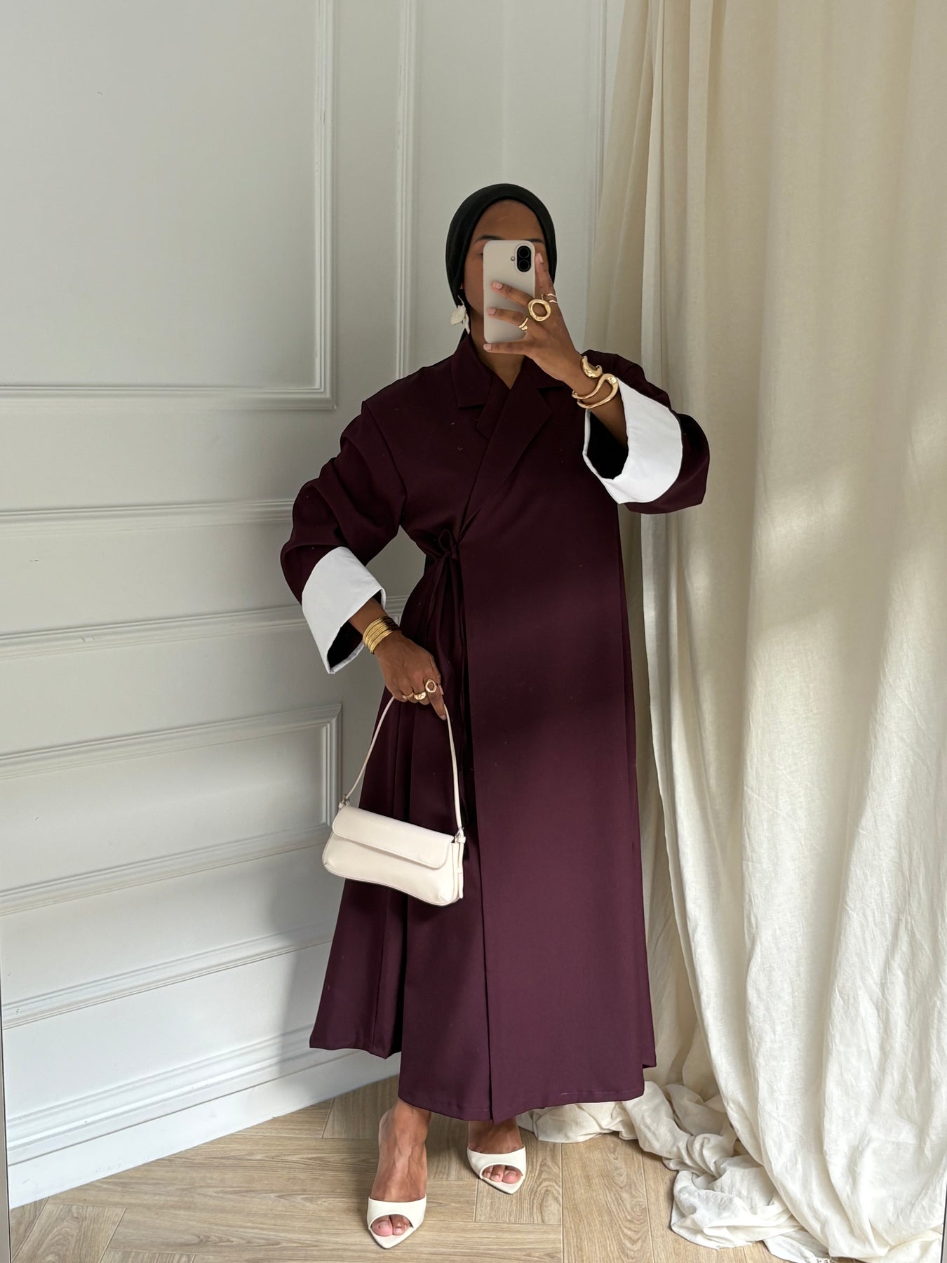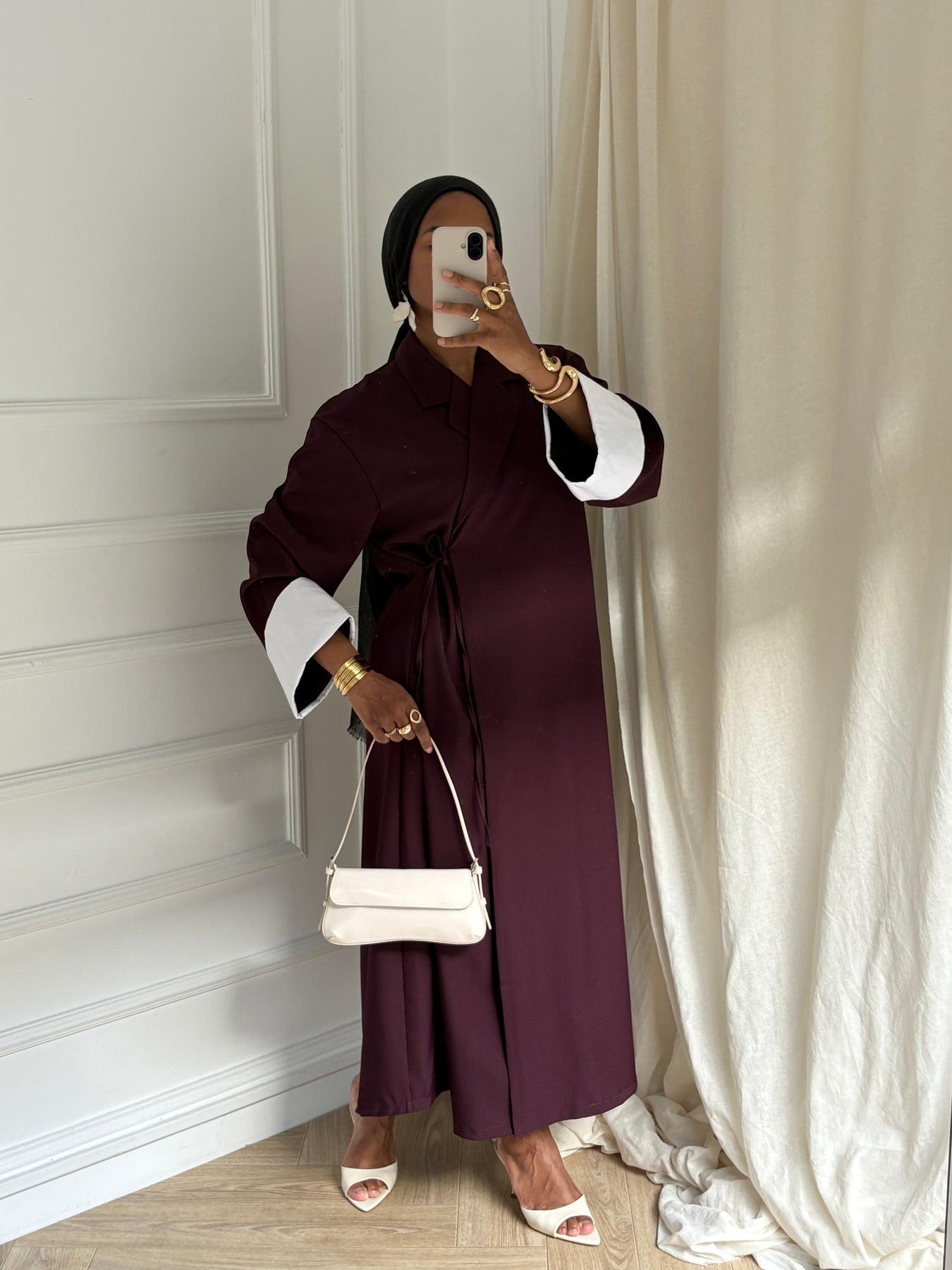 Opte pour l’élégance intemporelle avec notre abaya bi-colore au style unique. Inspirée de la coupe blazer, cette pièce revisite le classique de la modest fashion avec une touche moderne et raffinée. Son col contrastant et son effet cache-cœur apportent une silhouette chic et féminine, idéale aussi bien pour le quotidien que pour les occasions spéciales.