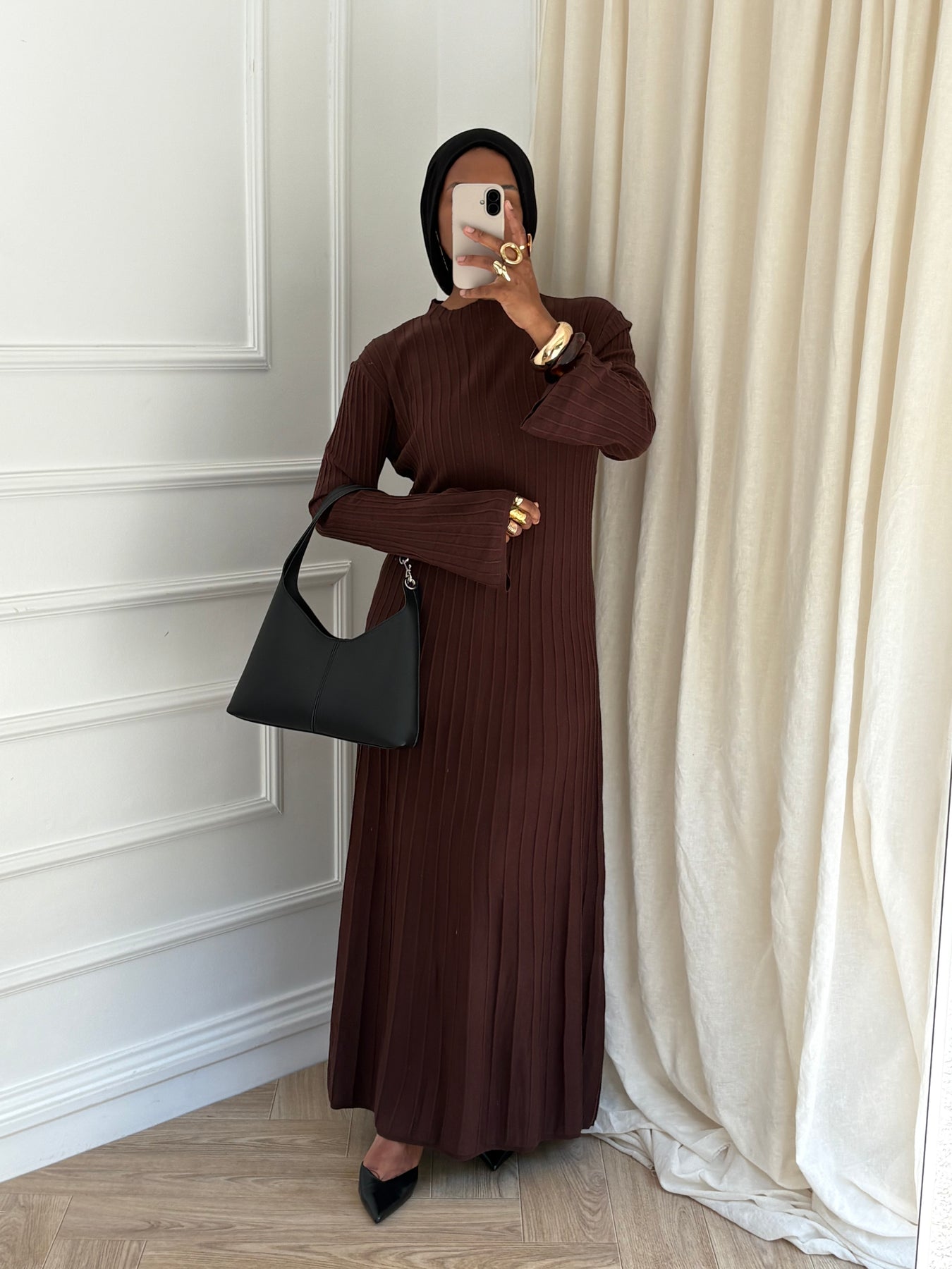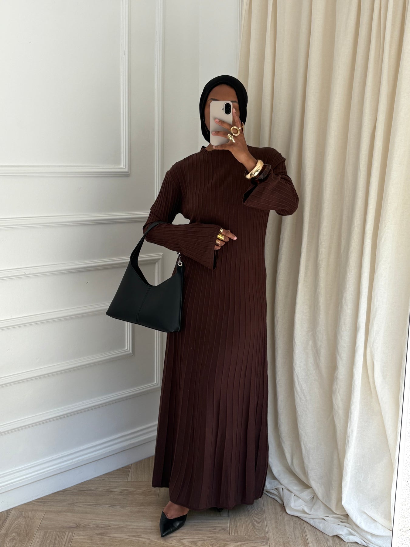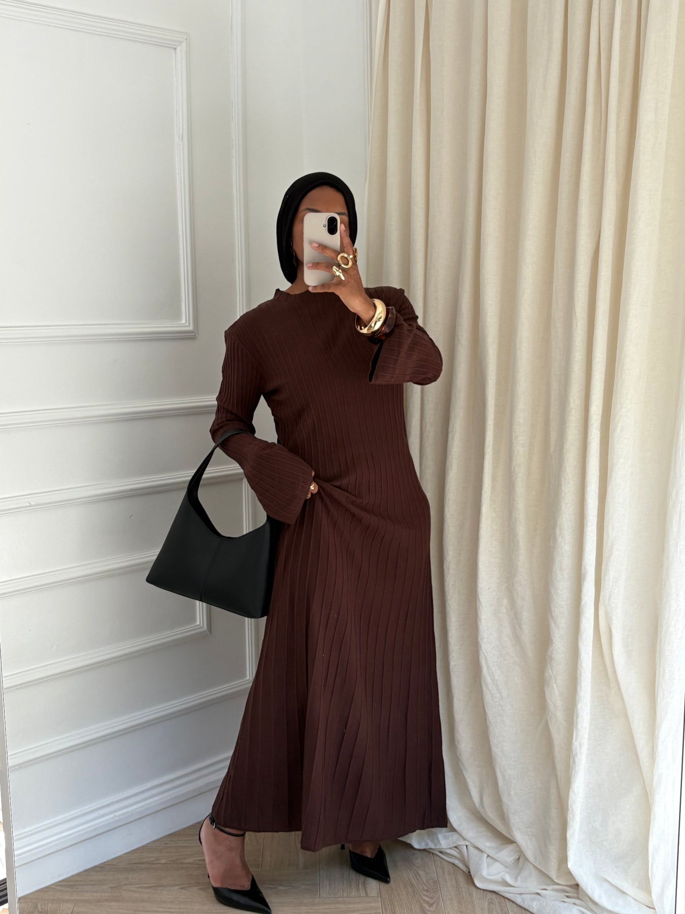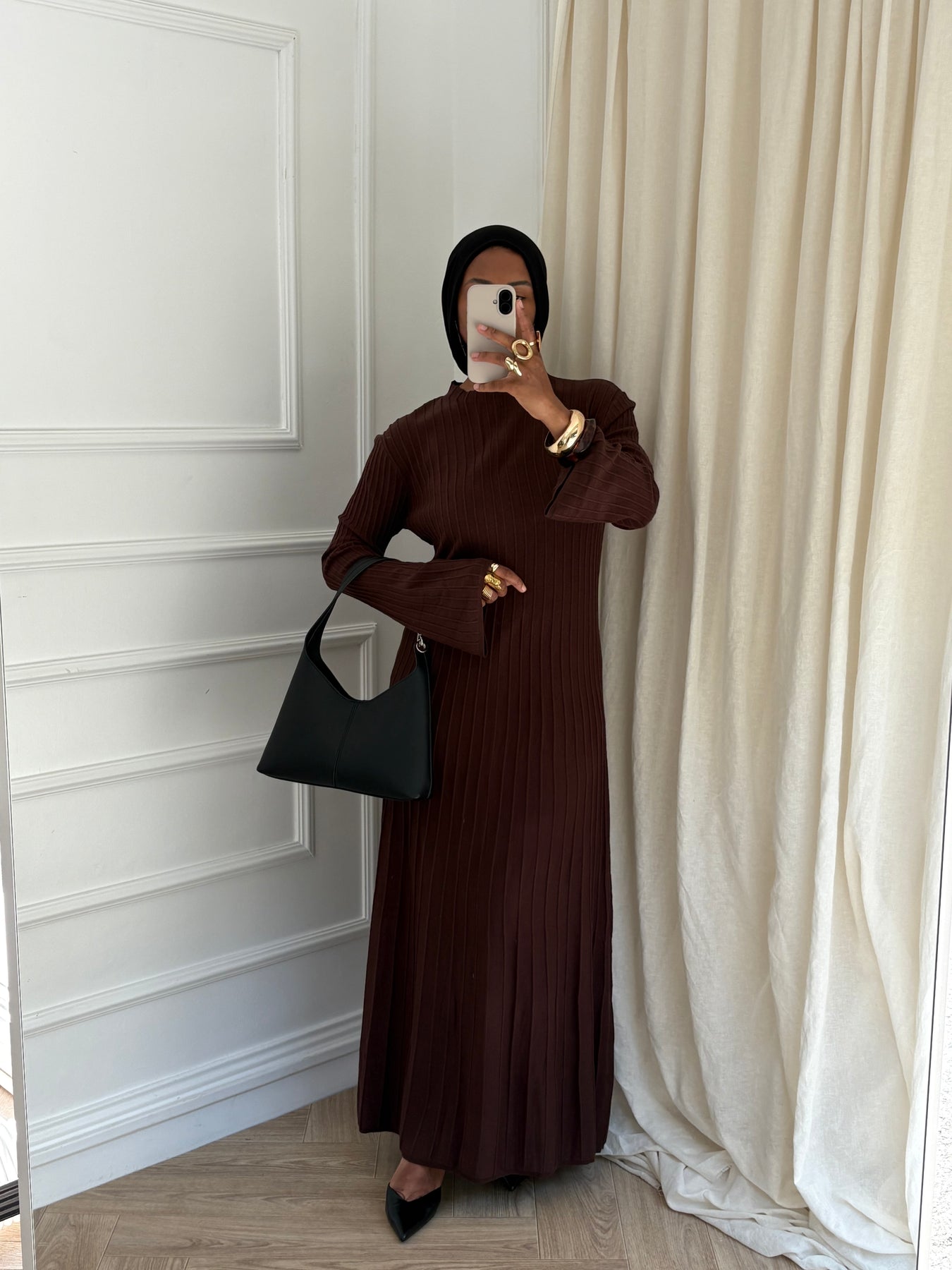 Robe longue à col rond et manches longues, confectionnée dans une maille douce et fluide.