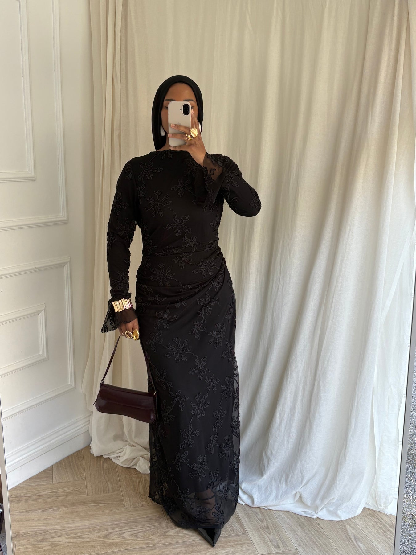 La modèle fait un 38 et mesure 1m63 (+ talons de 10 cm).