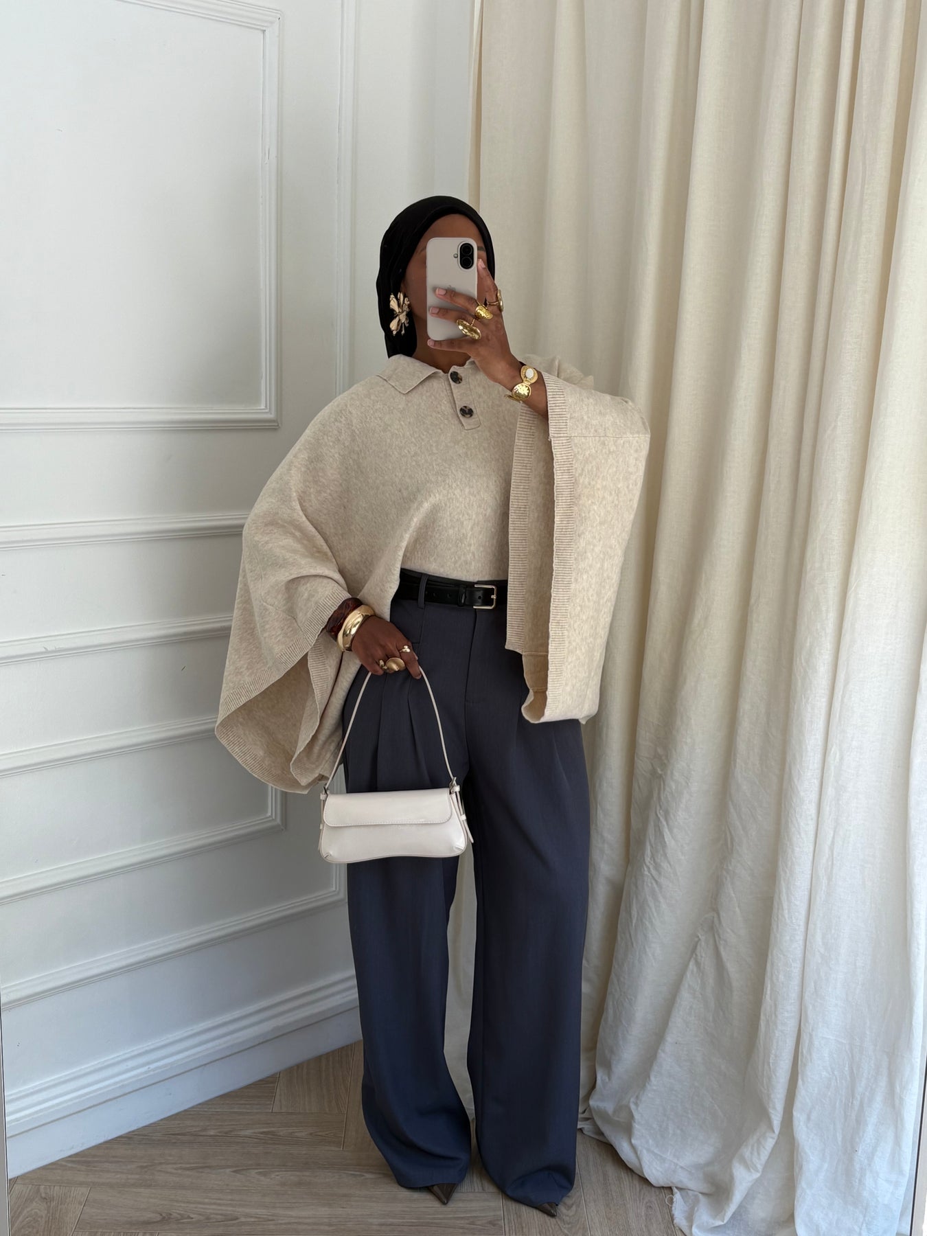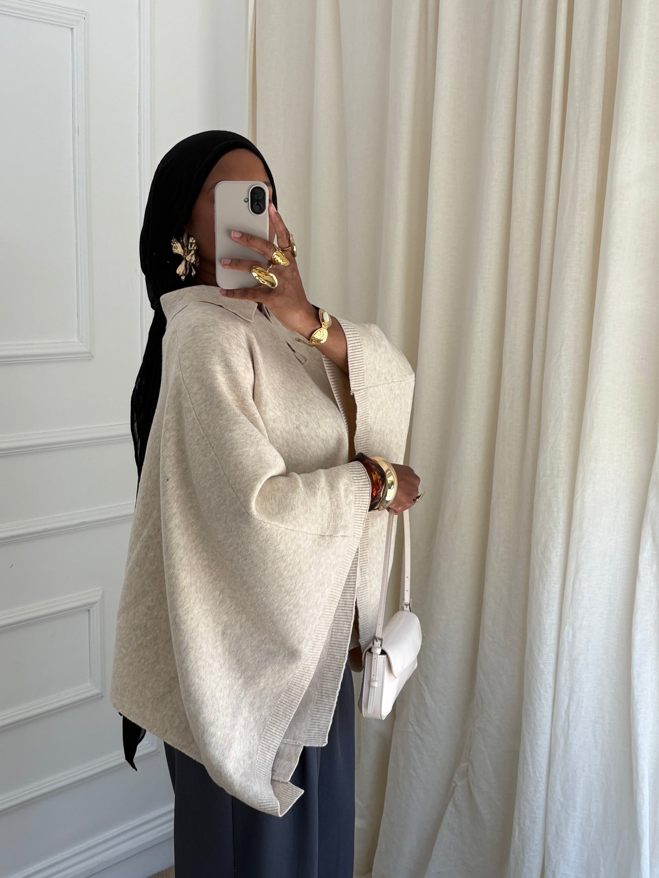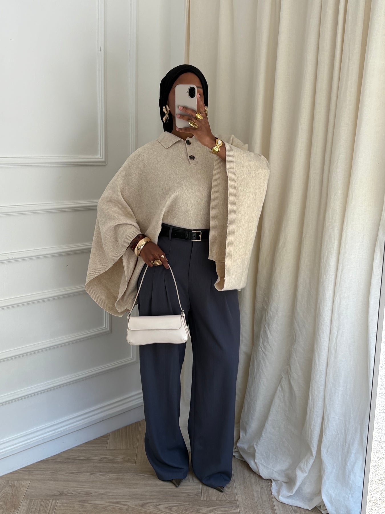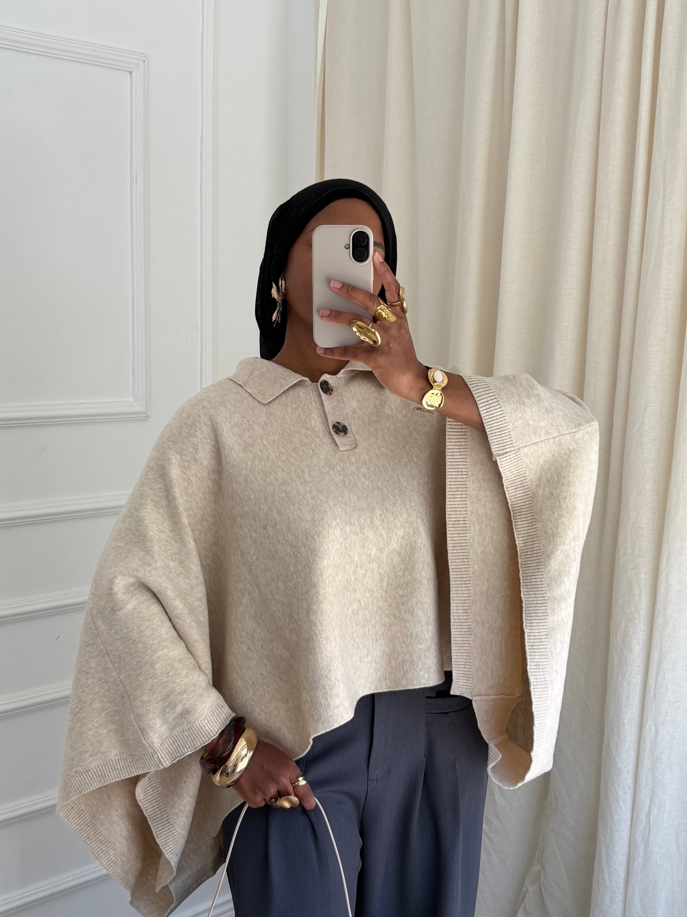 Cape courte au tombé fluide, confectionnée dans un mélange de fibres douces et structurées.