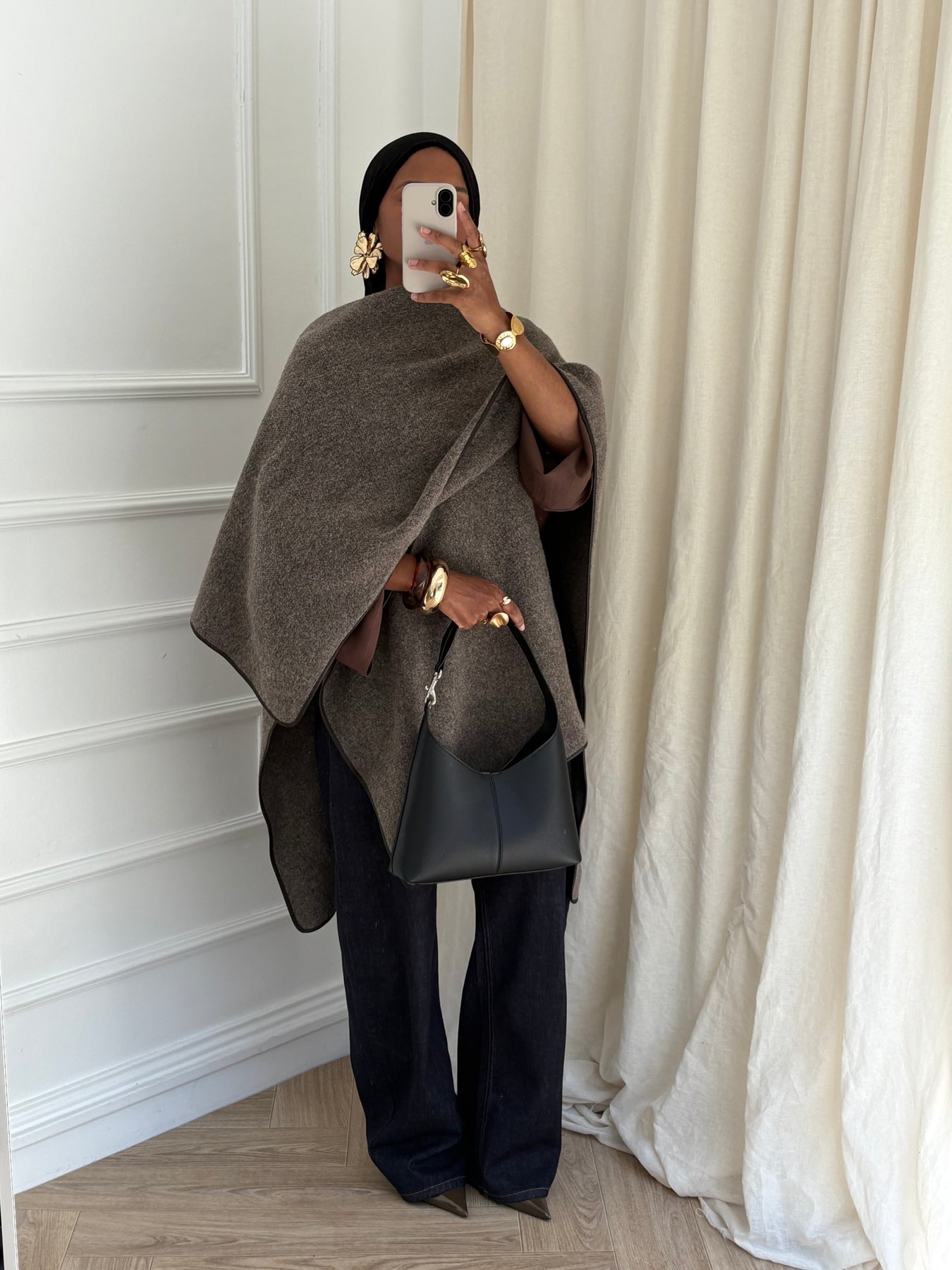 Cette cape de luxe se distingue par sa matière épaisse et lourde, qui lui confère un tombé élégant et structuré.