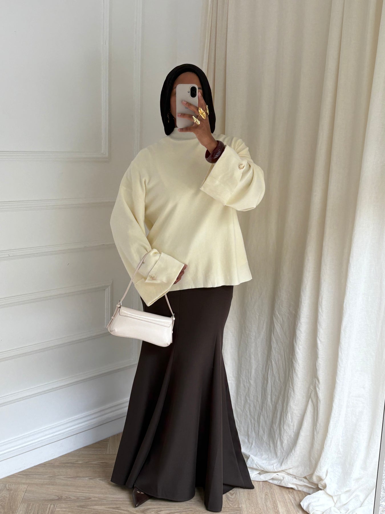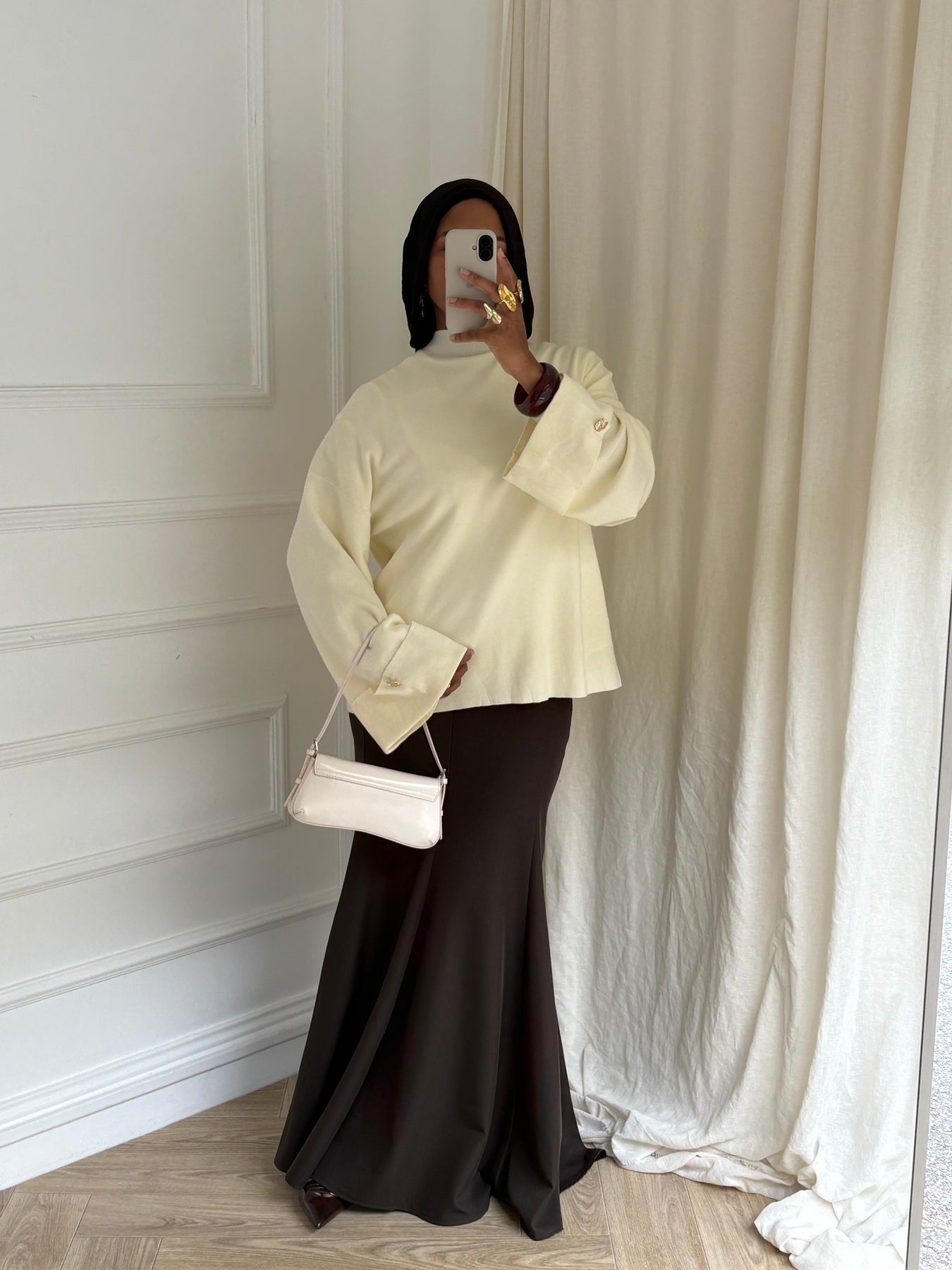 Un pull doux et raffiné, aux manches légèrement évasées pour une touche féminine subtile.