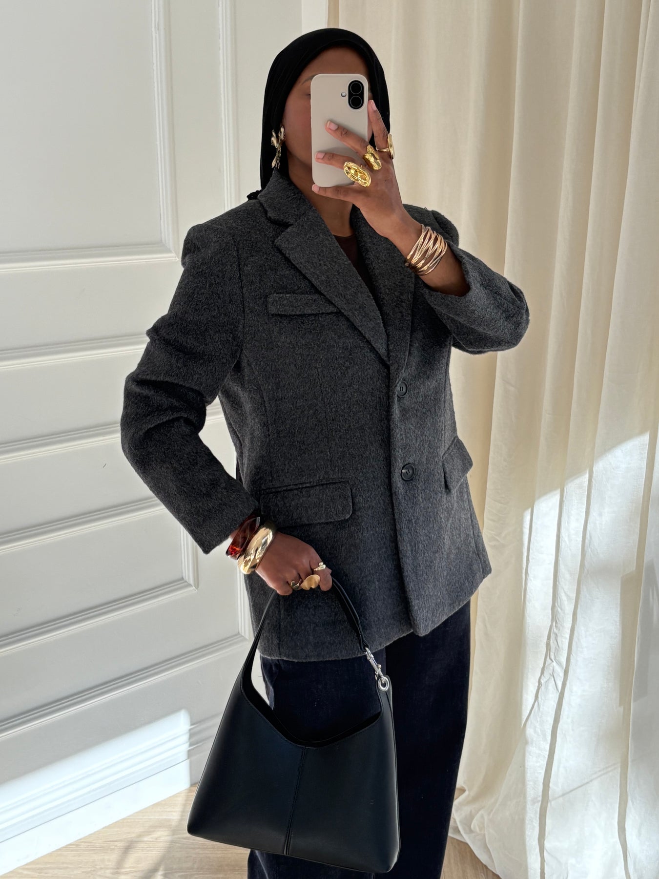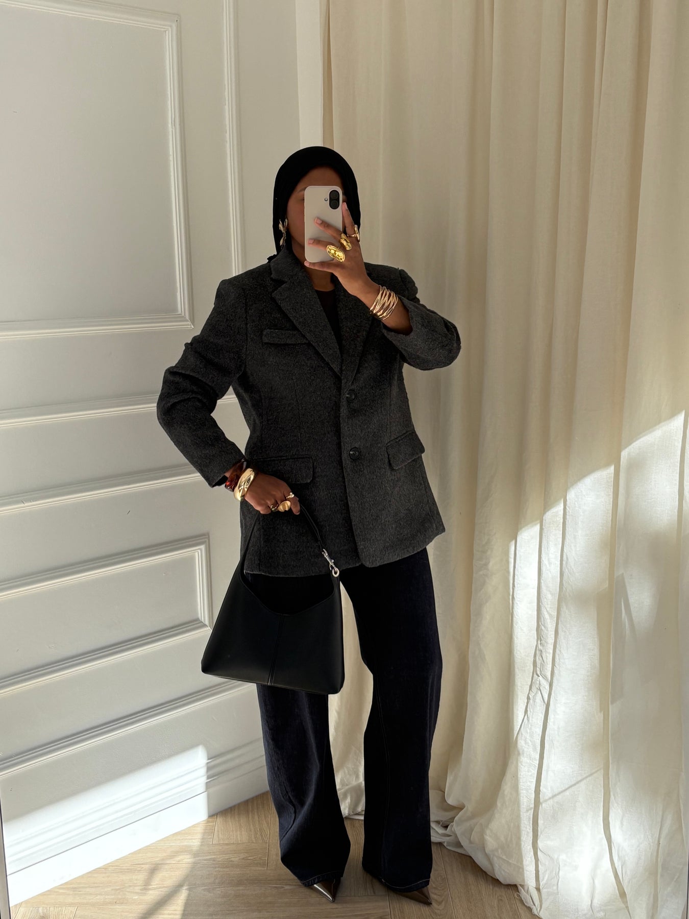 Avec sa coupe structurée et sa matière noble, ce blazer apporte une allure à la fois chic, moderne et intemporelle. Sa texture douce au toucher, grâce au mélange de laine et d’alpaga, en fait une pièce élégante et confortable — parfaite pour les journées fraîches où tu veux rester stylée sans effort. La mannequin mesure 1m63 et porte des talons de 10 cm — le blazer convient donc aussi bien aux femmes petites qu’aux grandes, grâce à sa coupe équilibrée et sa belle longueur.