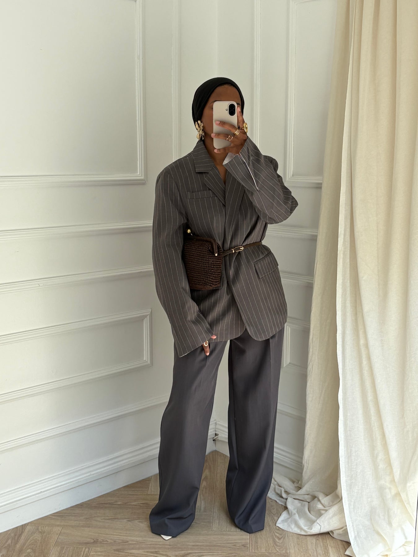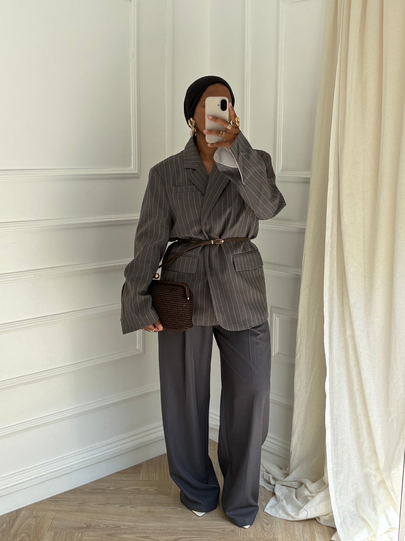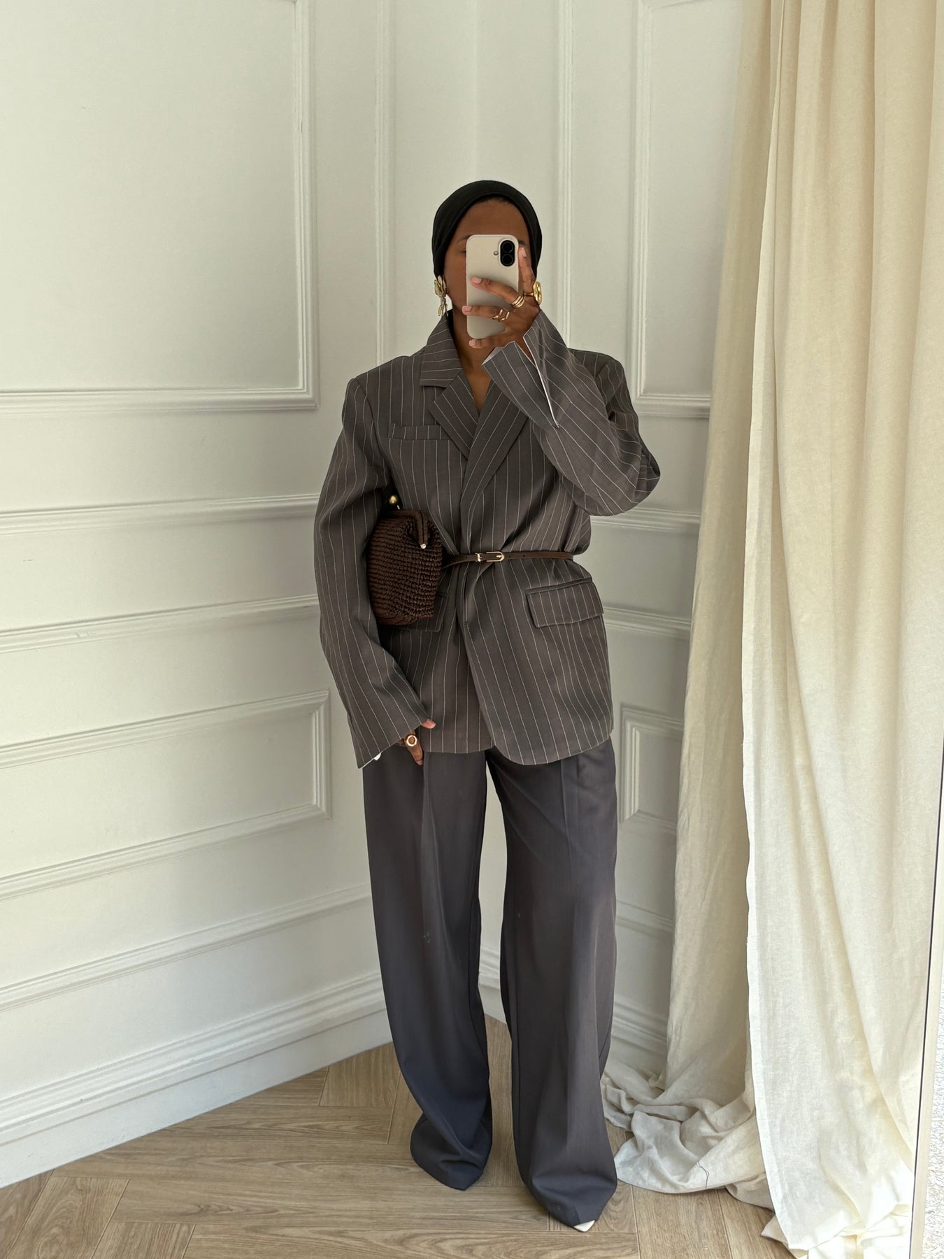 Un blazer rayé au style oversized, pour une coupe moderne et décontractée. Sa longueur de 77 cm assure une couvrance parfaite et un look tendance. Convient aux tailles 36 à 44, idéal pour un porté confortable et élégant.