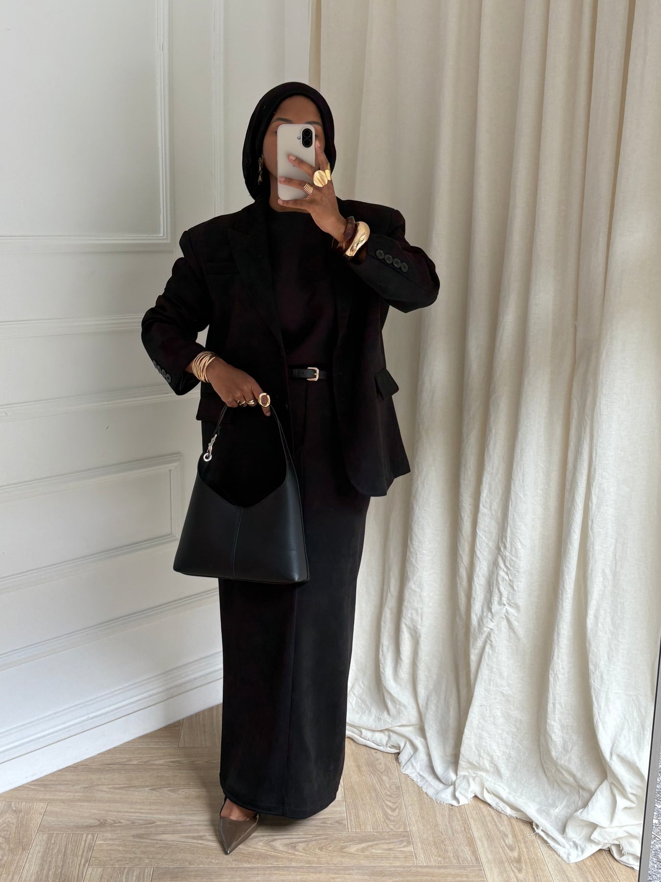 Blazer en suédine, assorti à la jupe longue suédine. Sa coupe droite et sa longueur couvrante en font une pièce élégante et confortable, idéale pour compléter une tenue hivernale chic. Sa matière douce effet suédine apporte une touche raffinée à toutes les silhouettes.