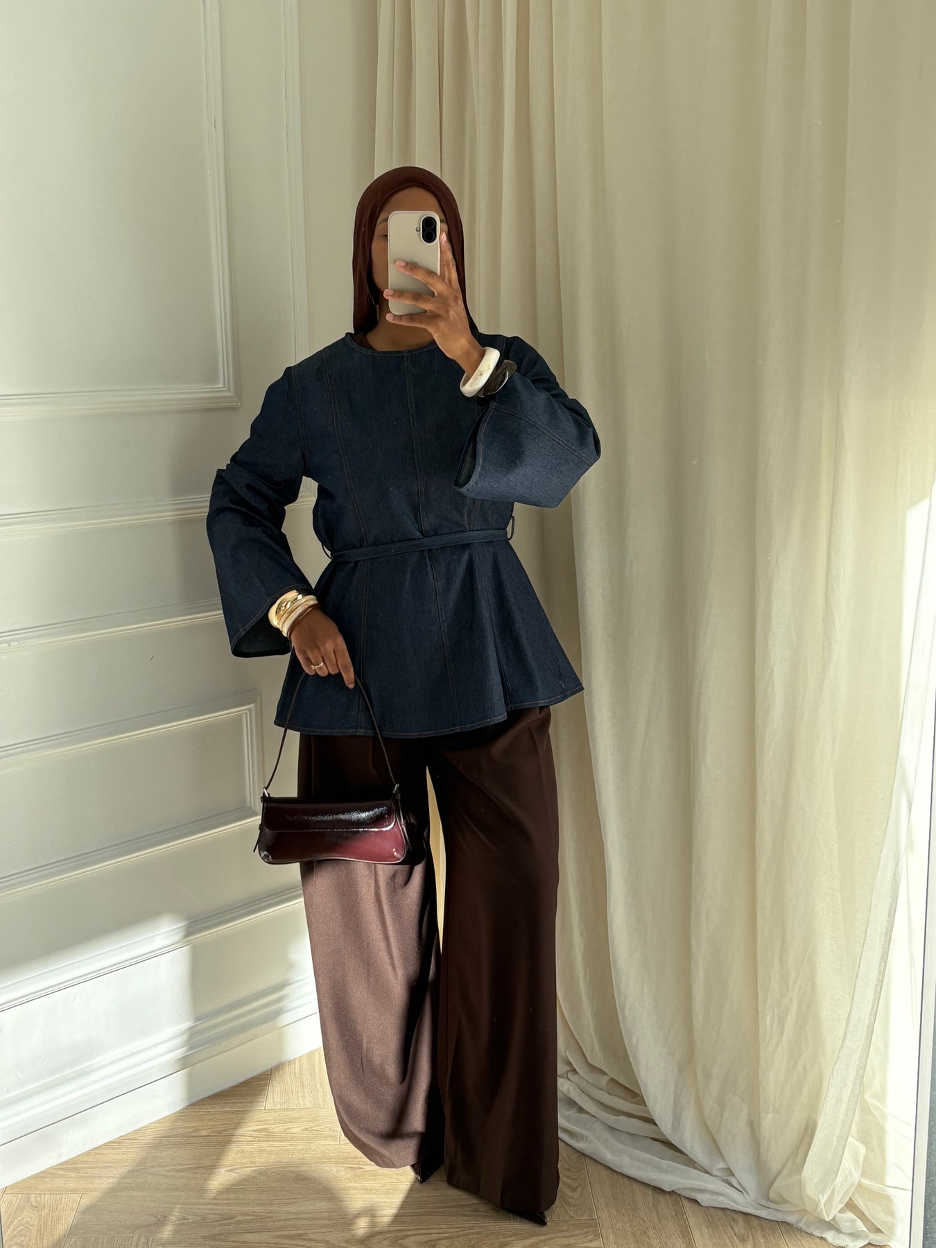 Une pièce indispensable pour un look chic et moderne. Cette blouse en jean offre une coupe structurée qui met en valeur la silhouette tout en restant totalement modest grâce à sa longueur et à ses manches évasées.
