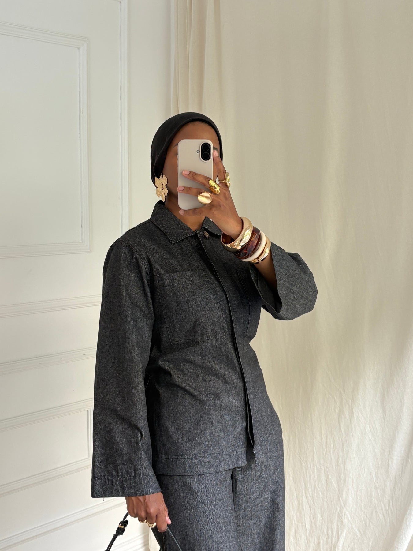 Composé d’un pantalon large en jean et d’une blouse en jean, cet ensemble peut se porter ample pour un look oversize tendance, ou cintré pour une allure plus structurée.
